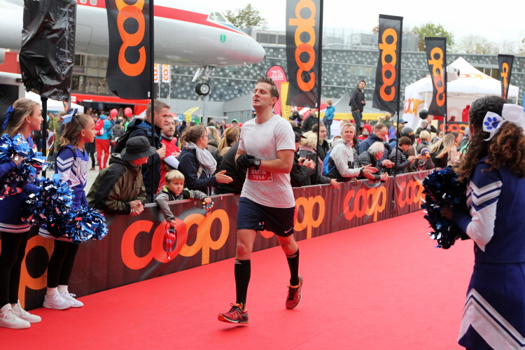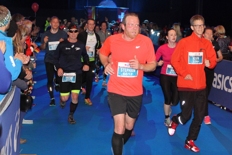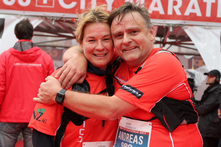 In weiterhin gleichmäßigem Tempo erreichen Yvonne und ich den Zieleinlauf im Innenhof des Verkehrshauses. Über den roten Teppich fliegen wir förmlich dem Zielbogen entgegen und machen eine zeitliche Punktlandung. Wir lassen uns die schöne Medaille umhängen und treffen außerhalb des Zielbereichs strahlende, zufriedene Gesichter an, welche uns über die ganze Strecke begleitet haben und ihre gewünschte Zielzeit erreicht haben.