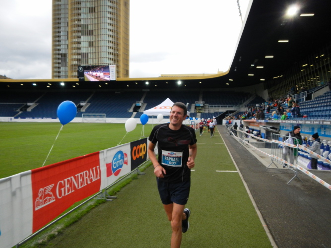 In der Läuferschar sehe ich keine torkelnden Gestalten am Spielfeldrand, ganz im Gegenteil: In anderen Jahren habe ich jeweils zahlreiche Halbmarathonis eingesammelt, die das Pulver für das letzte Drittel schon verschossen hatten. Heute ist es eher so, dass zurückgehaltene Energie dosiert eingesetzt und unsere Pacemakergruppe überholt wird. Für die Zuschauer stehen die Tribünen und Spielerbänke offen, in den VIP-Räumlichkeiten kann man dem friedlichen läuferischen Treiben bei einem leckeren Brunch folgen. Für einmal braucht sich niemand vor dem Pyro-Gespenst in den Fanblöcken zu fürchten. Ob es Zufall ist, dass Polizisten lieber bei einem Marathon Sonntagsdienst leisten als bei einem Fußballspiel?