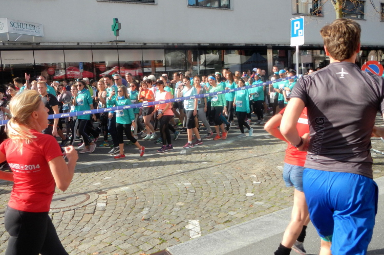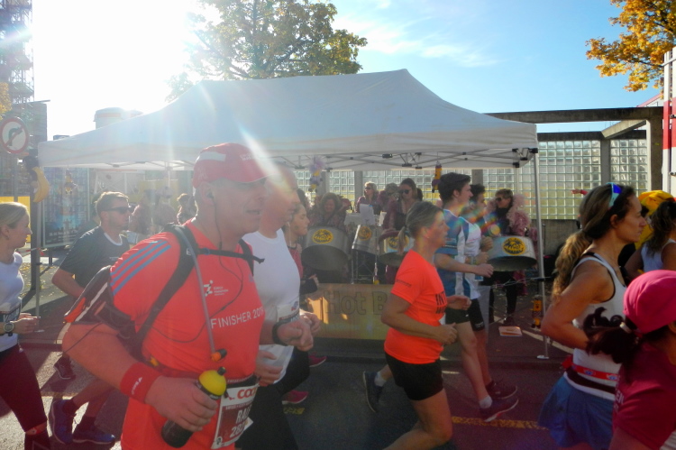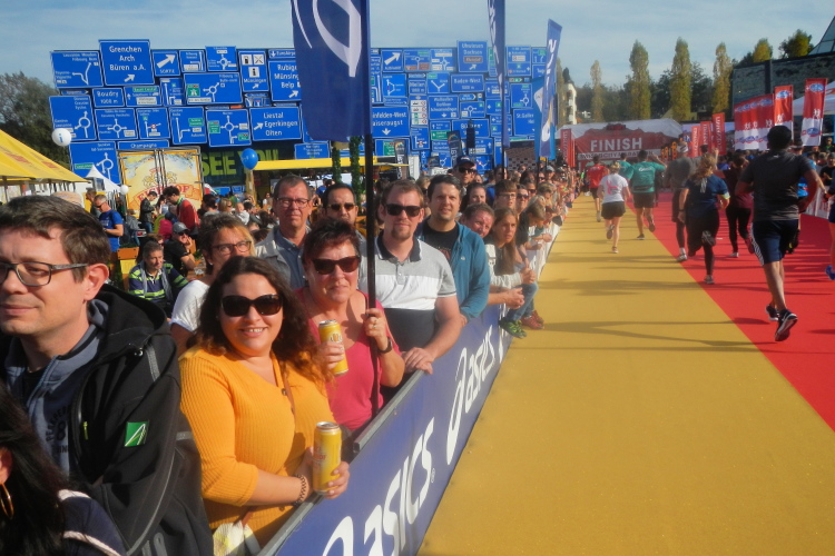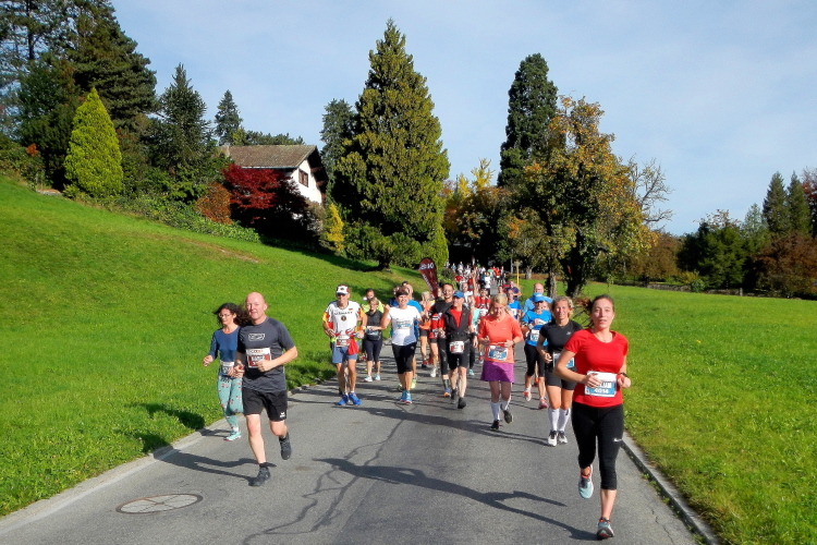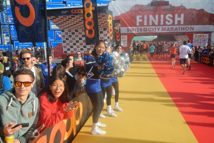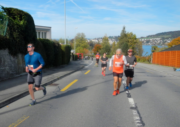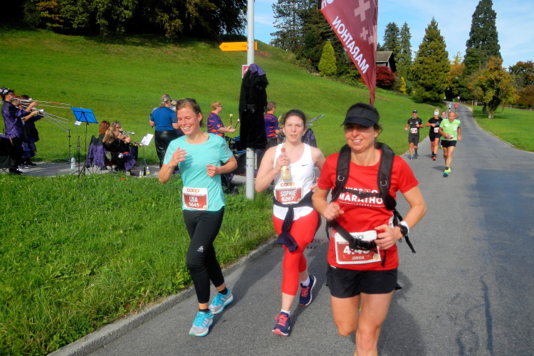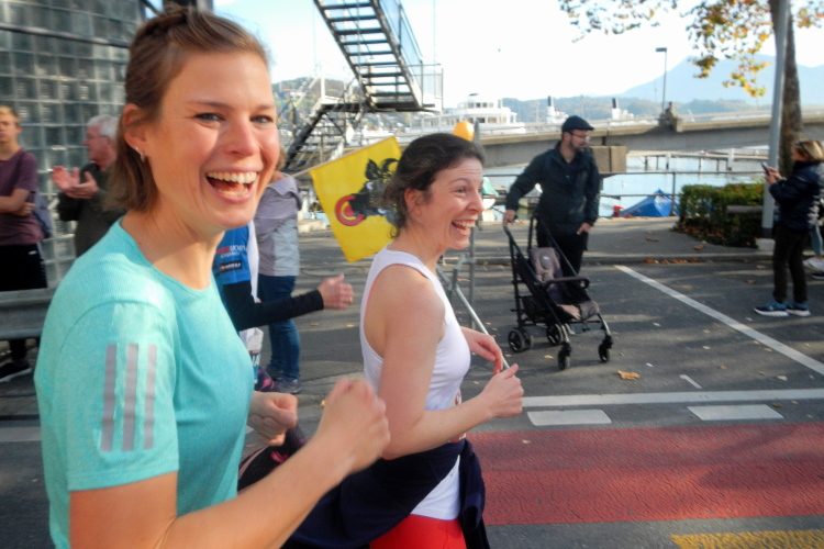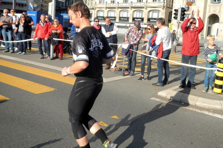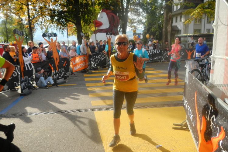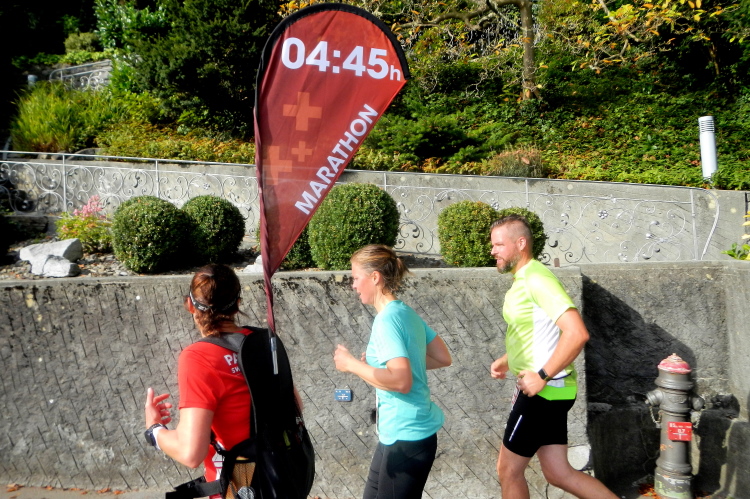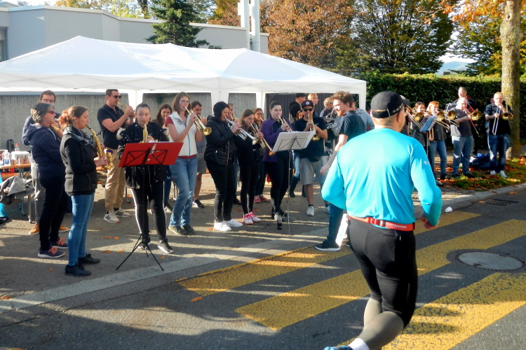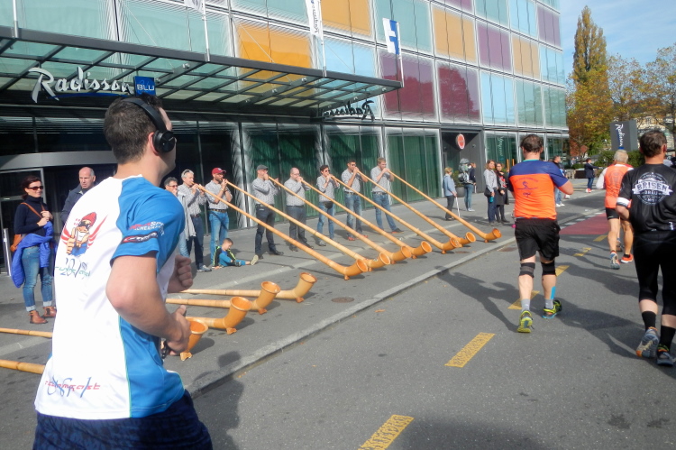 Trotz der großartigen Unterstützung von Zuschauern, Musikern, Musikanten und Helfern wird bei fast allen in unserer Gruppe deutlich, dass die Anwesenheit in dieser kein Zuckerschlecken ist. Je länger wir unterwegs sind, wird die Erlösung herbeigesehnt. Die Tafeln am Streckenrand zeigen, dass diese naht und die Horw eben erst in den Sturm entlassenen 10km-Läufer bewirken einen Sog, in welchem wir versuchen mitzufliegen.