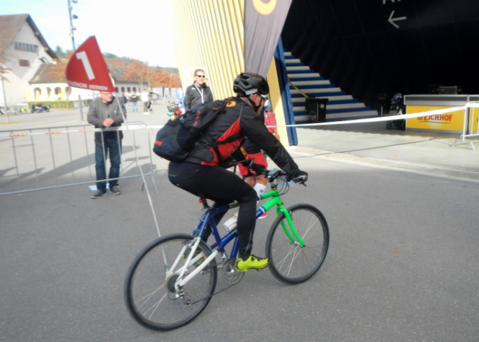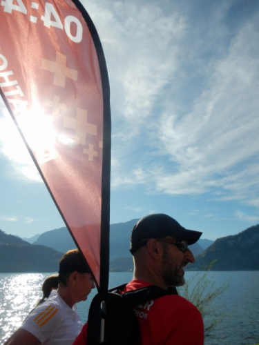Dann ist der Zeitpunkt gekommen, die Zwischenwelt zwischen Training und Finish, in welcher ich zweimal mit einem Gefolge um die Horwer Halbinsel gezogen bin, zu verlassen, begrüßt vom OK-Präsidenten selbst. Er übernimmt für die gejagten Seelen das Amt des Petrus und heißt uns im Reich der Erlösung willkommen.