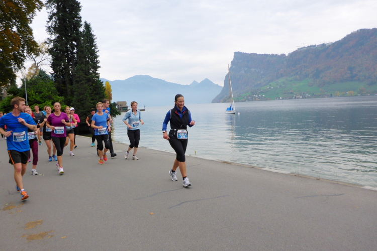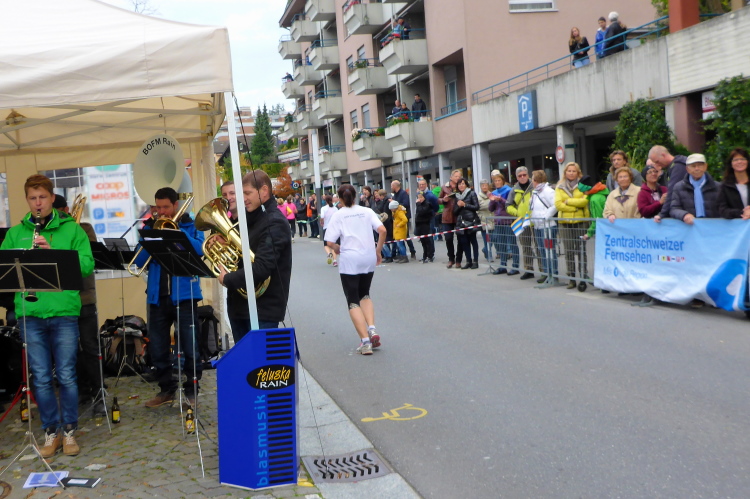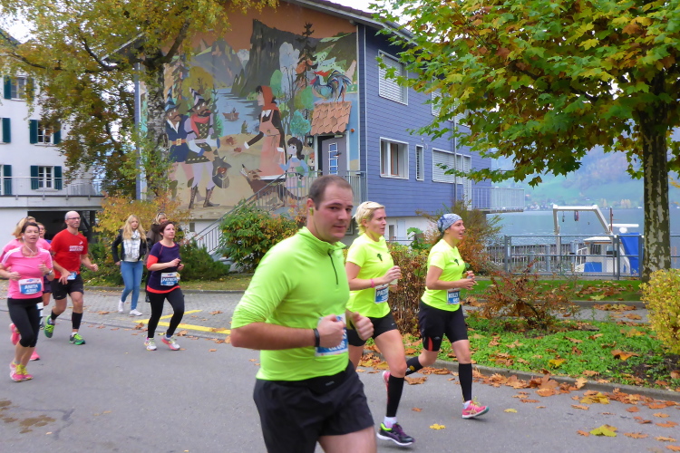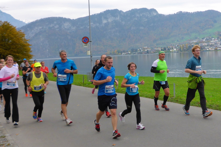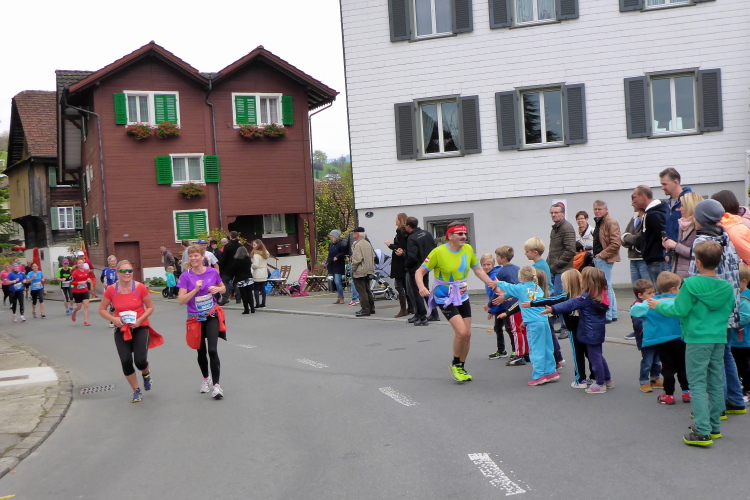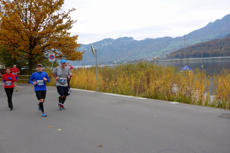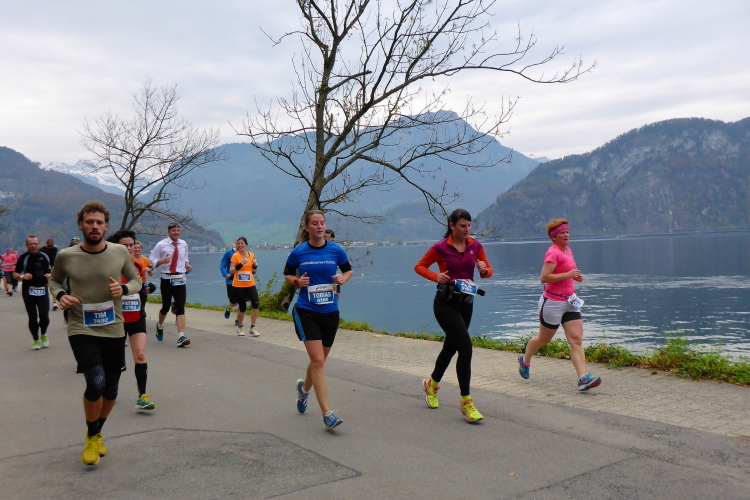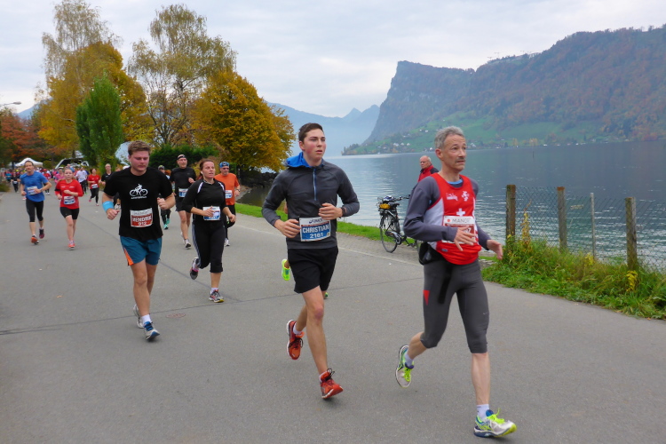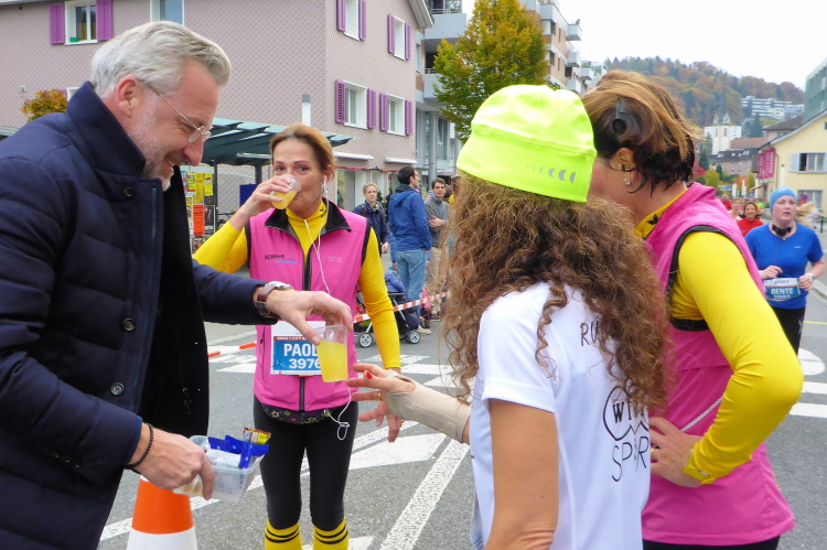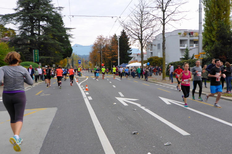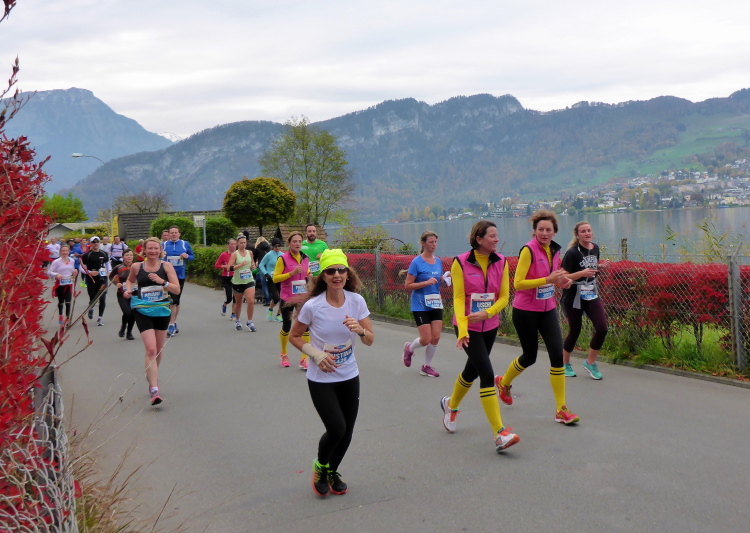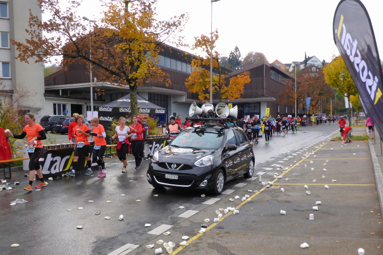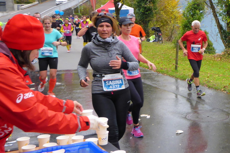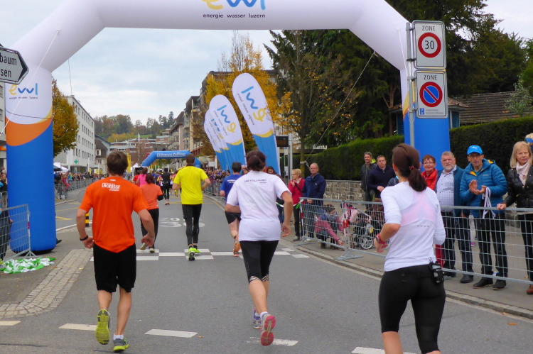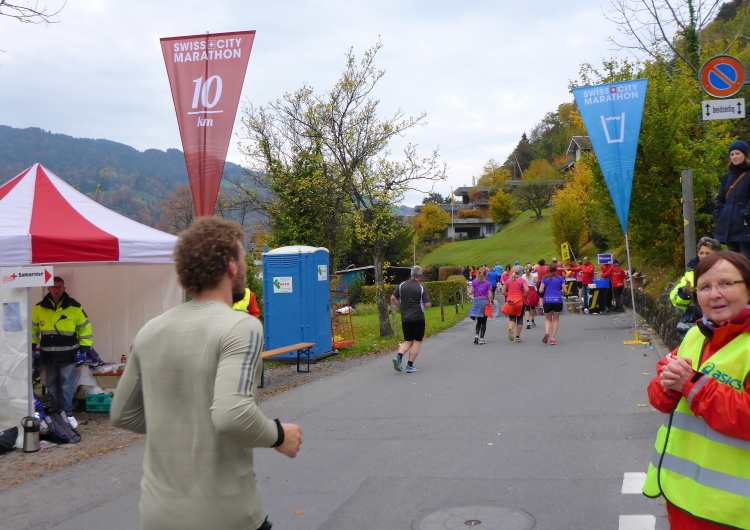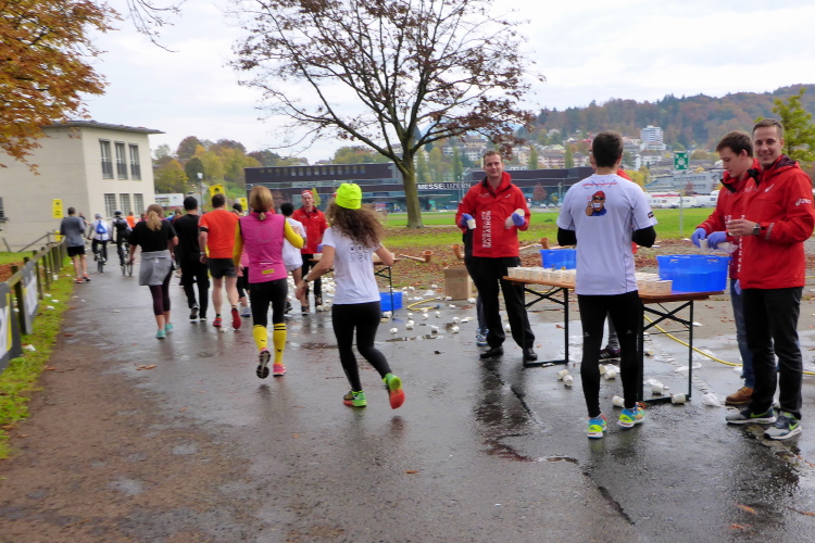 Bei km 10 teilen Helfer Wasser aus. Obwohl es mit Temperaturen um die 12 ° nicht wirklich warm ist, wird das von den Läufern dankbar aufgenommen. In Horw ist einiges geboten. Das ganze Dorf scheint auf den Beinen zu sein und gleich zwei Marathontore stehen auf der Hauptstraße. Die Außengastronomie platzt aus allen Nähten und jeder feuert die Läufer an. Livemusik rundet das Bild ab.