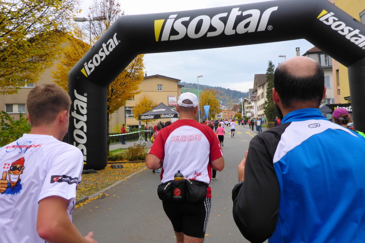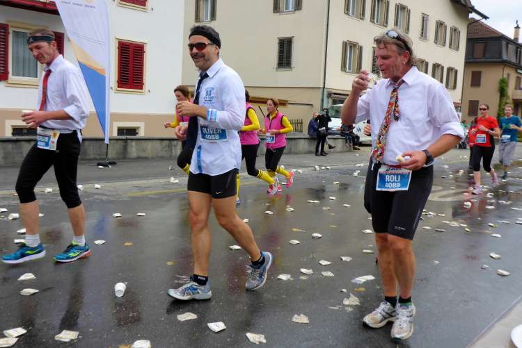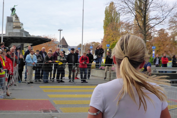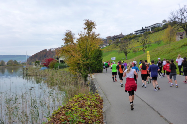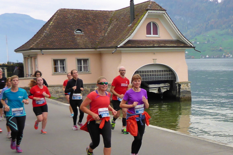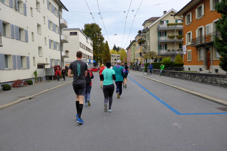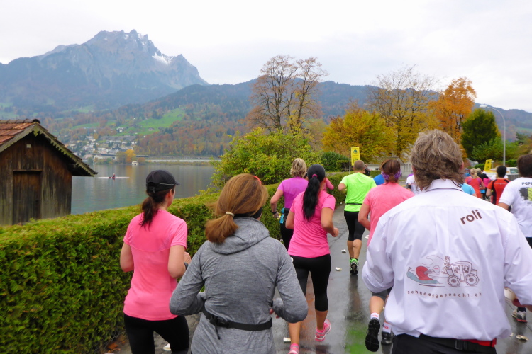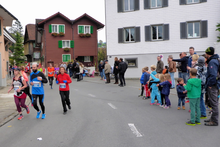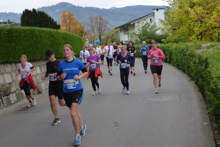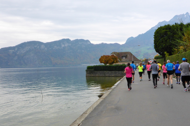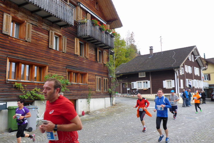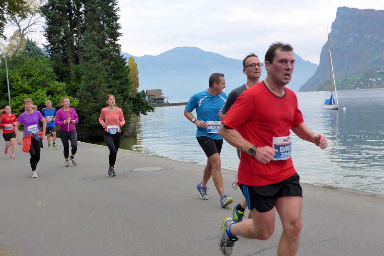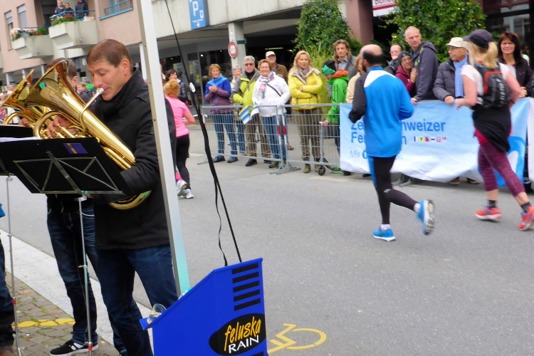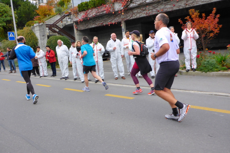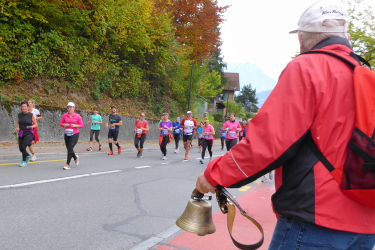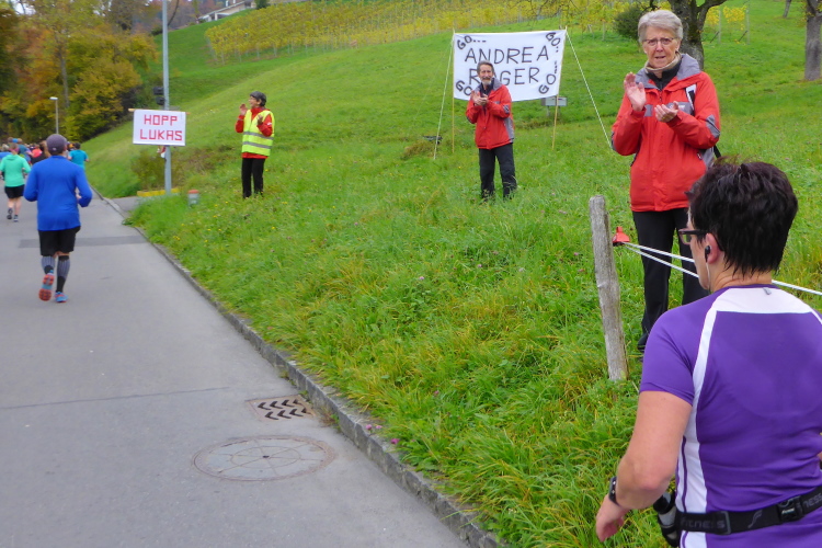 Bei km 10 teilen Helfer Wasser aus. Obwohl es mit Temperaturen um die 12 ° nicht wirklich warm ist, wird das von den Läufern dankbar aufgenommen. In Horw ist einiges geboten. Das ganze Dorf scheint auf den Beinen zu sein und gleich zwei Marathontore stehen auf der Hauptstraße. Die Außengastronomie platzt aus allen Nähten und jeder feuert die Läufer an. Livemusik rundet das Bild ab.