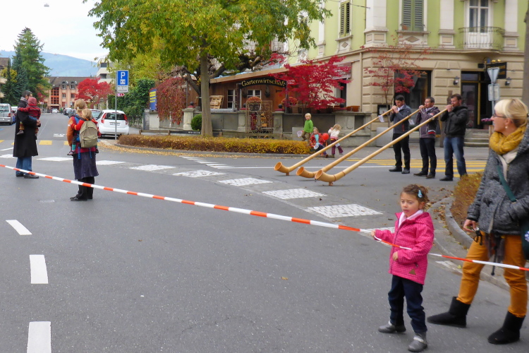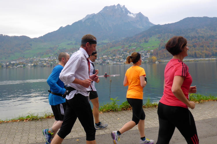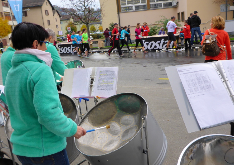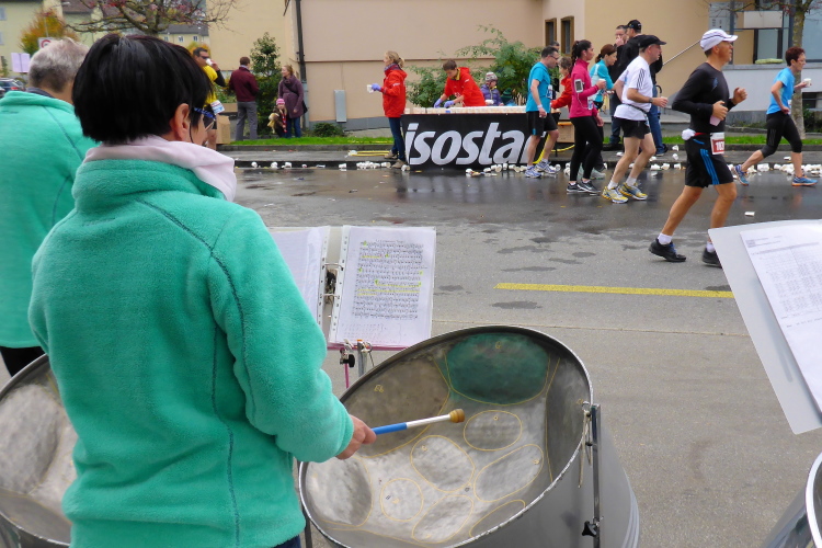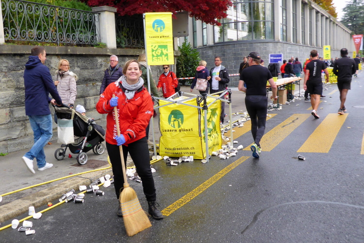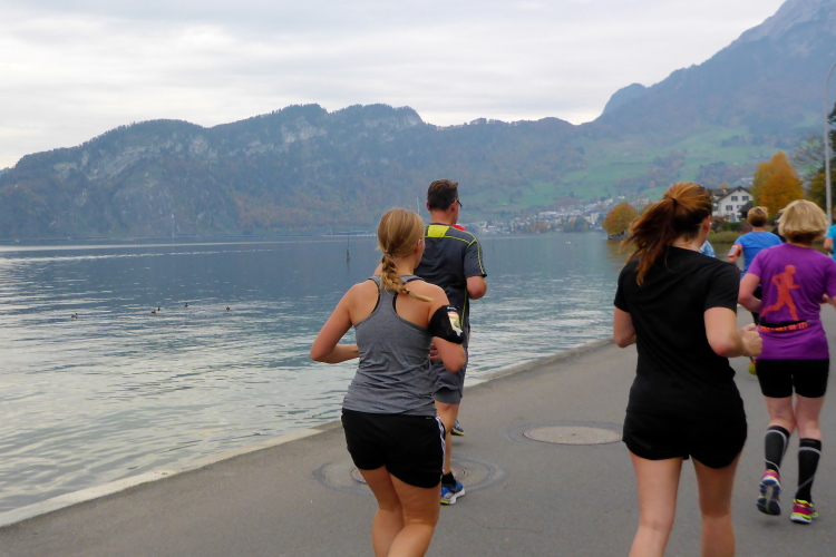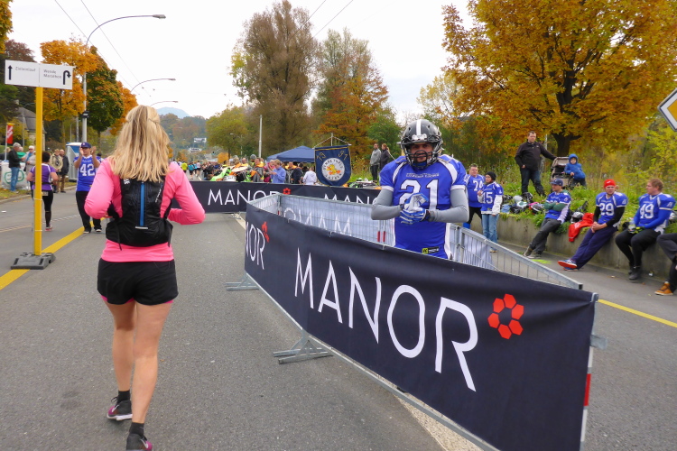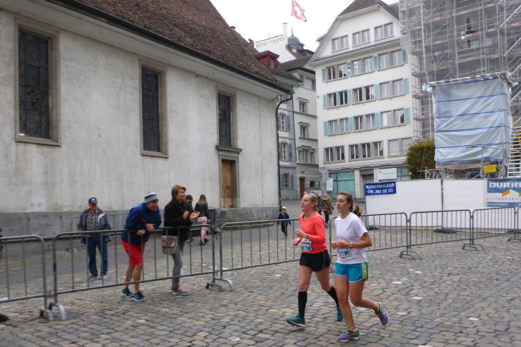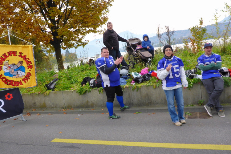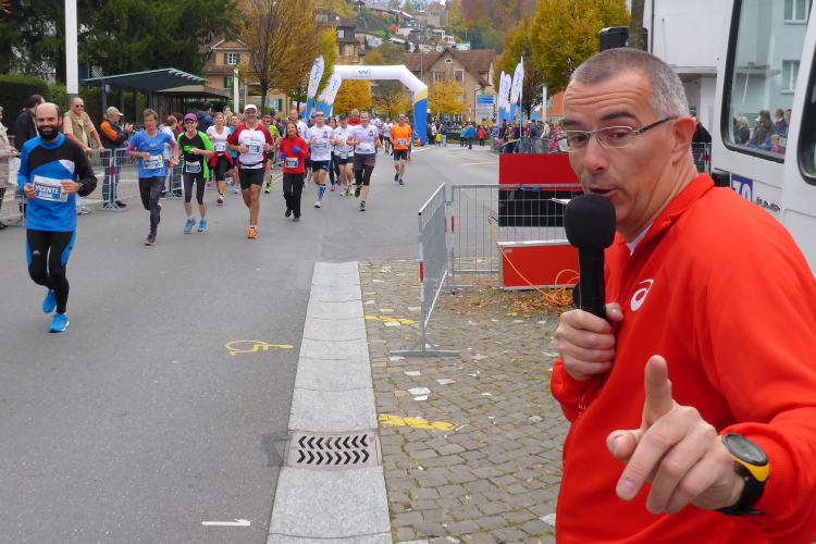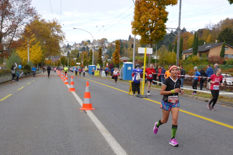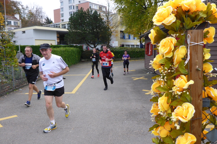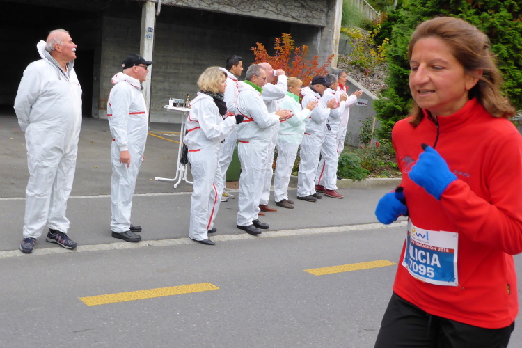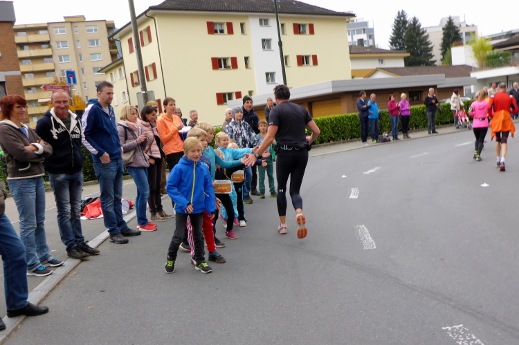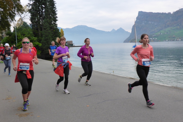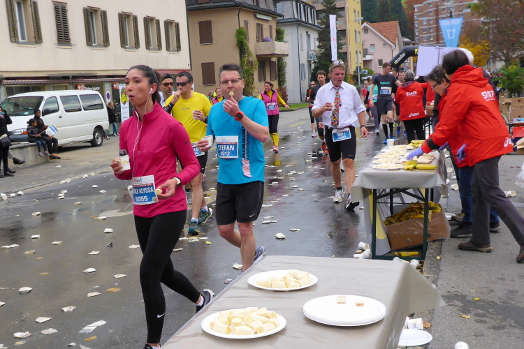 Bei km 10 teilen Helfer Wasser aus. Obwohl es mit Temperaturen um die 12 ° nicht wirklich warm ist, wird das von den Läufern dankbar aufgenommen. In Horw ist einiges geboten. Das ganze Dorf scheint auf den Beinen zu sein und gleich zwei Marathontore stehen auf der Hauptstraße. Die Außengastronomie platzt aus allen Nähten und jeder feuert die Läufer an. Livemusik rundet das Bild ab.