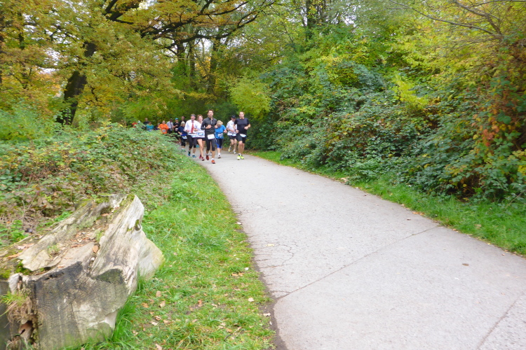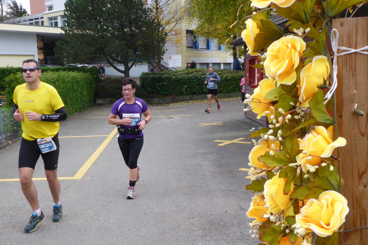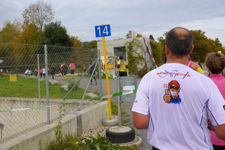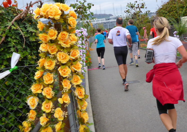Wir stärken uns an der VP und ich koste die mit weißer Schokolade überzogenen Riegel. Lecker! Es geht jetzt durch eine Schrebergartenkolonie des Familiengärtnervereins Luzern. Der Weg ist festlich mit Blumen geschmückt. Die Gärtner feuern uns an. Anschließend folgt ein Stück an den Bahngleisen entlang. Bei km 14 biegen wir in ein Wäldchen ein, aus dem wir, mit Blick auf die Luzerner Messehallen, an der VP wieder ausgespuckt werden.