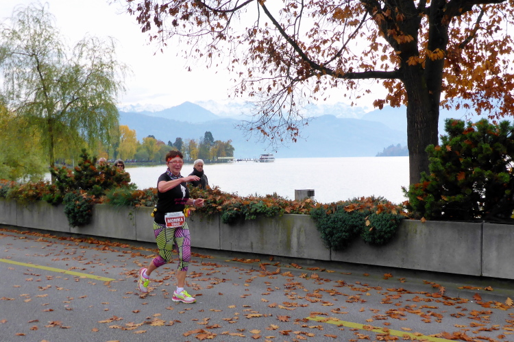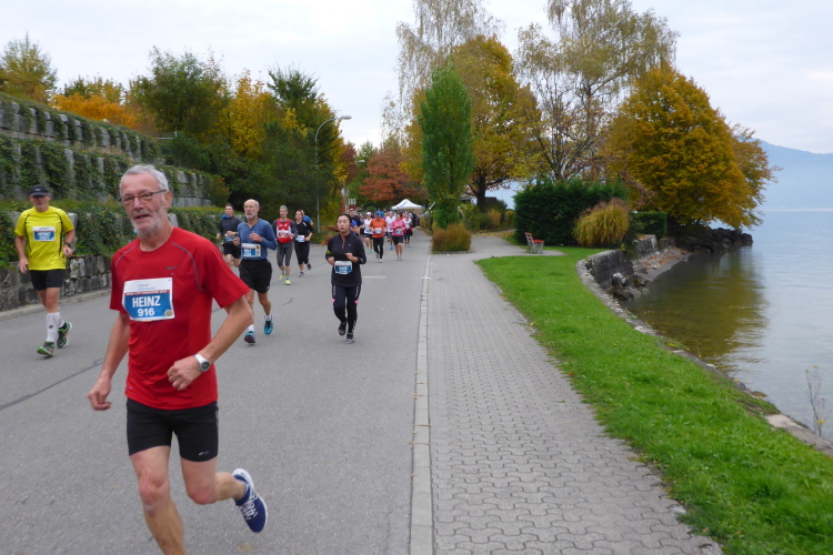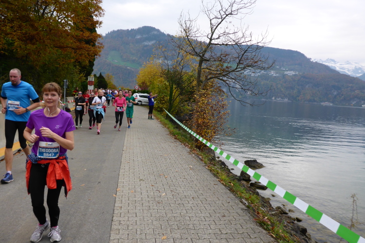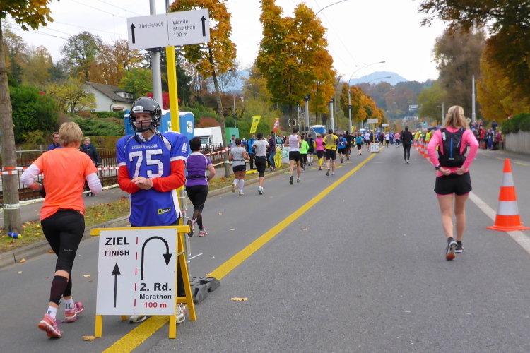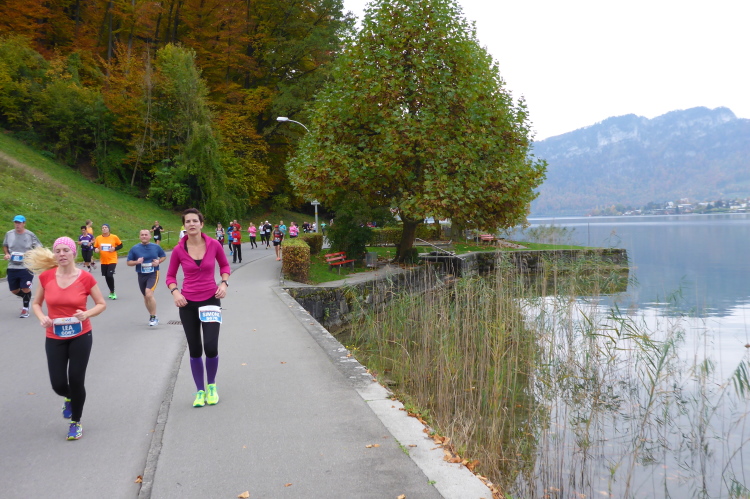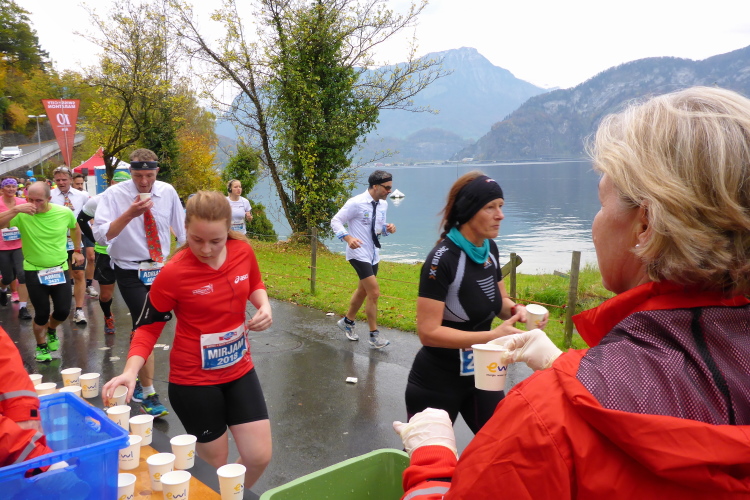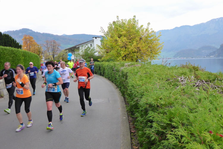 Wir laufen jetzt auf der Seestraße direkt am See entlang. In Deutschland gäbe es hier sicher ein Geländer, um den See abzusperren. Hier stehen alle paar Meter Streckenposten. Hinter km 9 ist eine Gruppe am Feiern. Mit gefüllten Gläsern stehen sie Spalier und prosten den vorbeikommenden Läufern zu. Dicht am See geht es weiter. Hier gab es im Mai, nach langanhaltenden starken Regenfällen, einen verheerenden Erdrutsch. 250 m³ Geröll und Steine haben die Straße auf 50 m Länge verschüttet. Mittlerweile ist die Strecke für Radler und Fußgänger wieder geöffnet. Es wird versucht, mit Betonelementen den Hang provisorisch abzustützen. Die fällige Sanierung kann noch dauern, weil hier erst noch der Bund zustimmen muss.