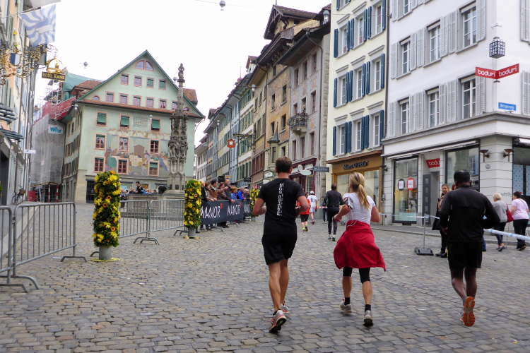In der schmalen Gasse der Altstadt reihen sich die Schaufenster der Nobelmarken aneinander. Wir laufen zwischen den schönen alten Häusern parallel zur Reuss richtungsmäßig wieder zurück. Der Weinmarkt, das frühere Stadtzentrum, ist mit Blumen geschmückt. Für die Läufer wurde ein Weg abgesperrt. Früher war auf diesem Platz der Fischmarkt, bis Mitte des 16. Jahrhunderts die Markthalle abgerissen wurde. Das auffällig buntbemalte Haus aus dem Jahre 1530 war damals die Apotheke. Der Brunnen davor stammt aus dem Jahr 1481, ist aber eine Kopie. Das Original kann im Historischen Museum der Stadt besichtigt werden.