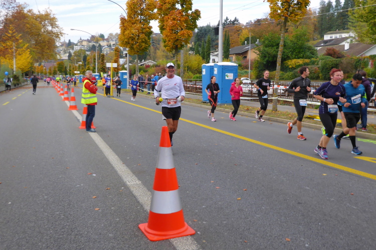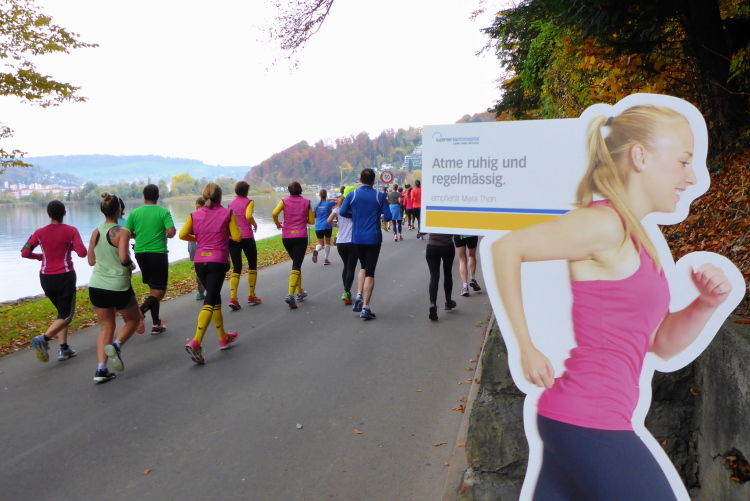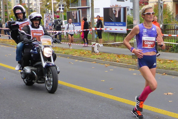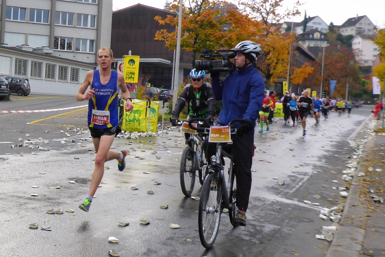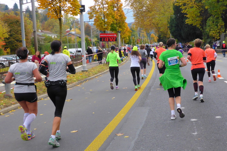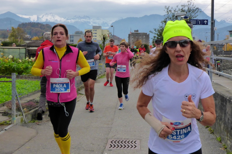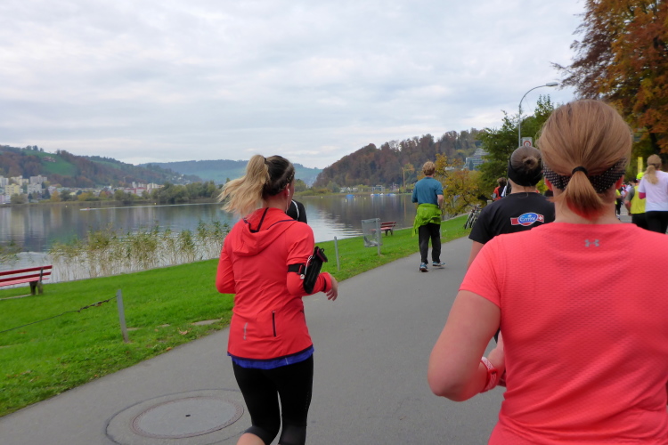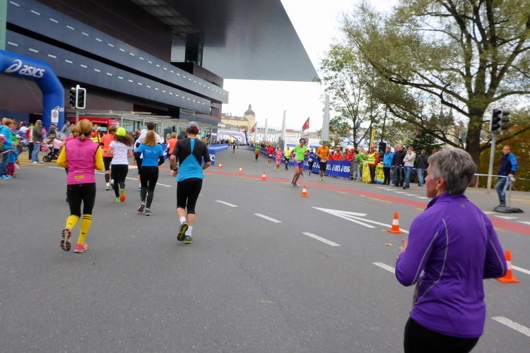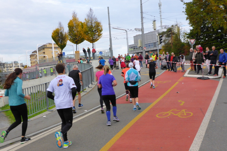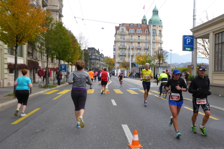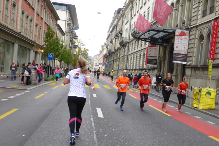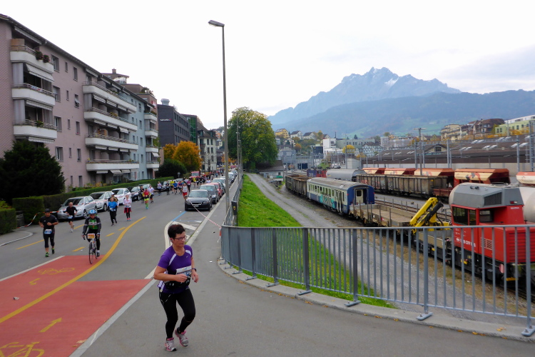 Auf Luzerner Vorortstraßen werden wir mit Musik und viel Publikum begleitet. An der VP bei km 16 kommen plötzlich von hinten Fahrräder und bitten die Läufer, sich rechts zu halten. Das folgende Auto mit großer Digitaluhr kündigt den führenden Marathonläufer an. Die Uhr zeigt 2:09. Mit langen Schritten und hochkonzentriert flitzt Fabian Kuert an mir vorbei. Der zweite, Stephan Wenk, schenkt mir sogar ein kleines Lächeln, als er kurze Zeit später angerauscht kommt. Gerade biegen wir auf einen schmalen Radweg ein und dann ein Stück zwischen Industriegebäuden hindurch. Es geht links durch das langgezogene Gebäude der SUVA, der Schweizer Unfallversicherungsgesellschaft. Nochmal links und wir befinden uns auf der Werftstraße.