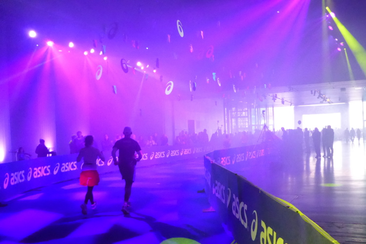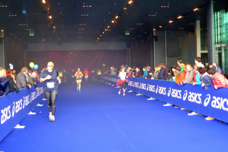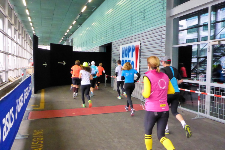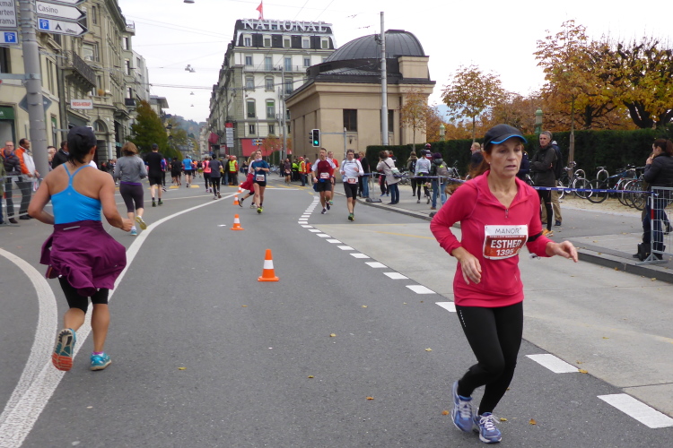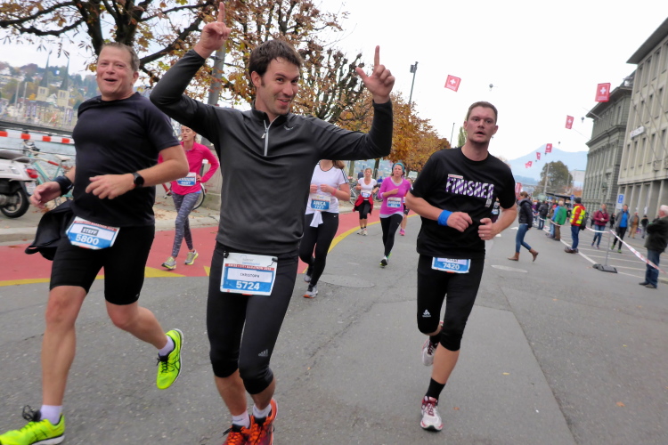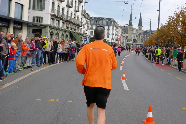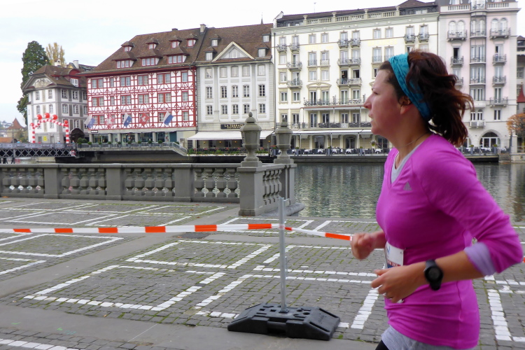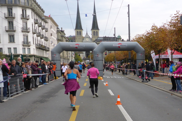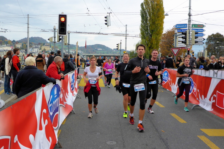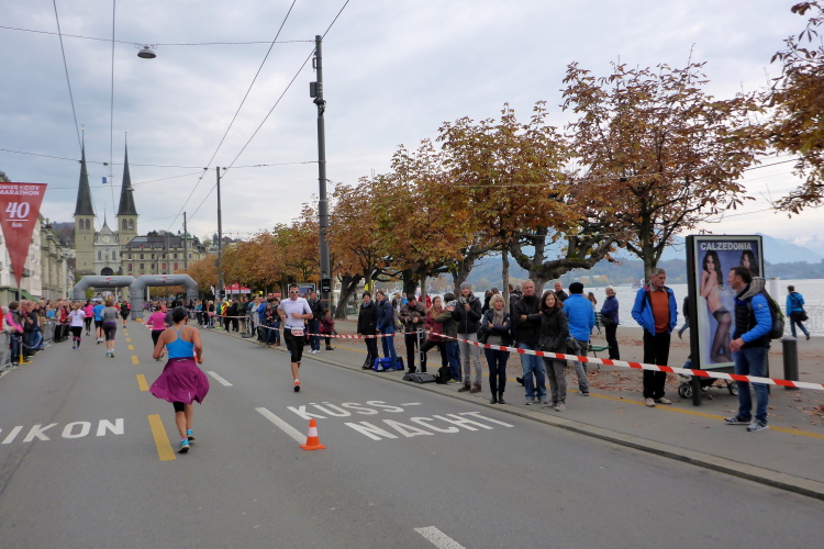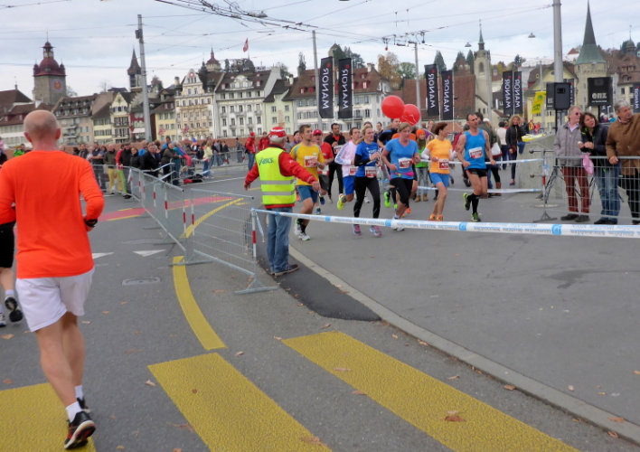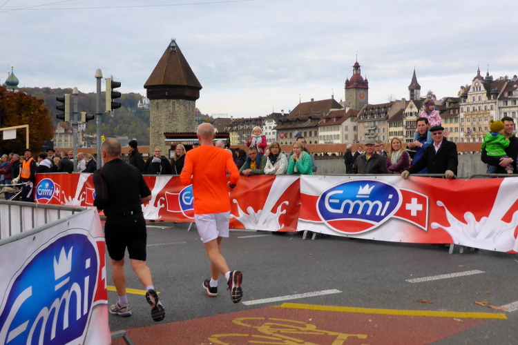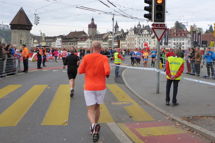 Diese Straße ist jetzt in der Mitte geteilt. Auf der anderen Spur kommen nun die schnelleren Läufer entgegen, die die Wende bei km 21 bereits hinter sich haben und sich nun auf der zweiten Runde befinden. Am KKL biegt unser Weg unverhofft scharf links in einen abgesperrten Bereich. Pfeile weisen uns direkt in das Gebäude hinein. Drinnen ist es fast völlig dunkel. Bunte Lichter, Nebelschwaden und laute Musik erinnern an eine Diskothek. Die Zuschauer hinter den Absperrgittern veranstalten dabei einen Höllenlärm. Wer hier emotionslos durchläuft, ist selber schuld. Vom Spalier der Chearleader werden wir nach draußen geleitet. Dort warten noch mehr Zuschauer und noch mehr Applaus. Kurz geht es an den uns wieder entgegenkommenden schnelleren Läufern am Bahnhof vorbei, dann trennt sich erneut die Strecke. Wir lassen die Seebrücke rechts liegen und laufen geradeaus Richtung Altstadt. Die Kapellbrücke mit dem markanten achteckigen Wasserturm liegt jetzt direkt vor uns. Der Turm ist vom Grund ab 34,5 m hoch und diente lange Jahre als Gefängnis. Heute ist er sicher das am meisten fotografierte Gebäude der Stadt.