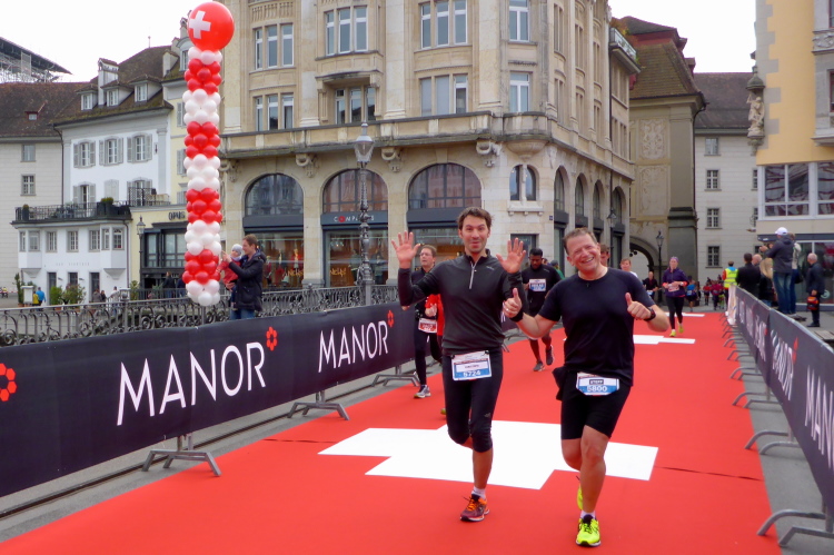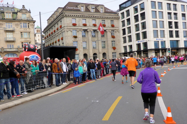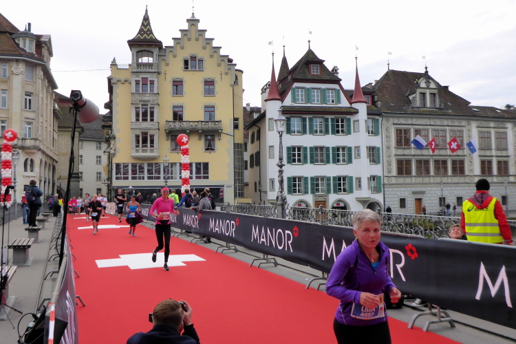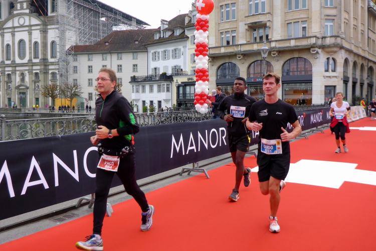 Direkt an die Kirche grenzt der „Rittersche Palast“, der als Wohnungen für Jesuiten gebaut wurde. Seit 1804 ist er zum Regierungsgebäude umfunktioniert und nun Sitz der Kantonsbehörden. In der nächsten Kurve stehen Zuschauer, die uns mit Applaus auf den vor uns liegenden Reusssteg geleiten. Dieser ist mit einem roten Teppich ausgelegt, den das Schweizer Wappen, das weiße Kreuz, ziert. Die rot-weißen Luftballonkaskaden und das rechts von der Brücke liegende ebenfalls in rot-weiß gehaltene Gebäude des Modehauses Schild passen richtig gut zusammen. Auch hier hat Alphafoto einen ihrer zahlreichen Fotografen postiert, der so manchen Läufer zu einem Luftsprung veranlasst.