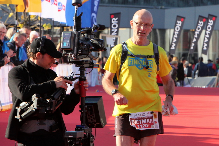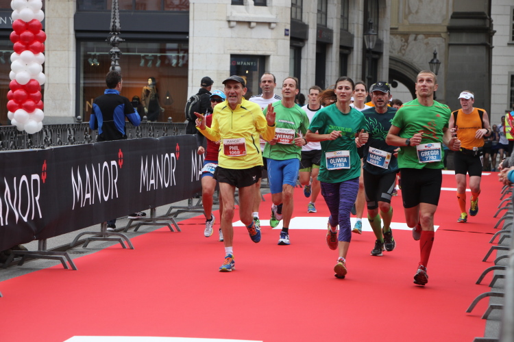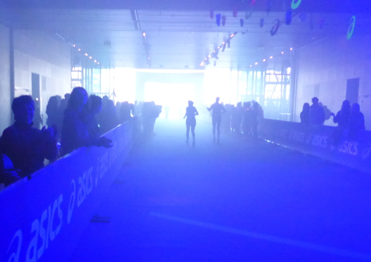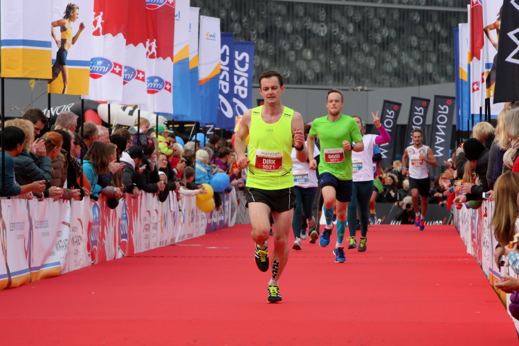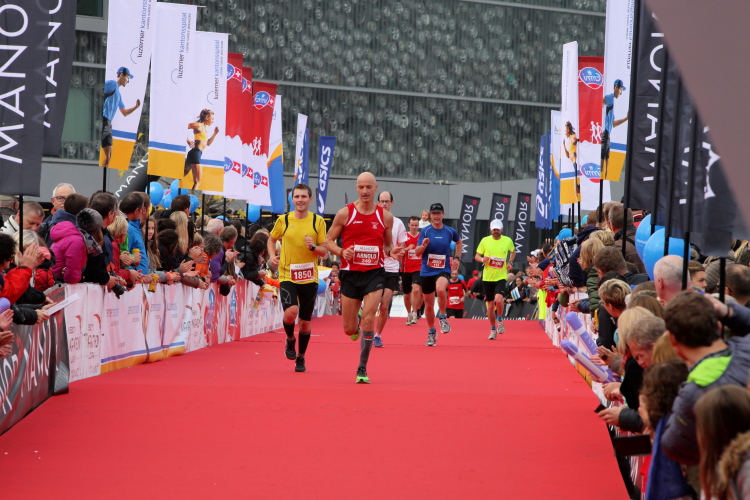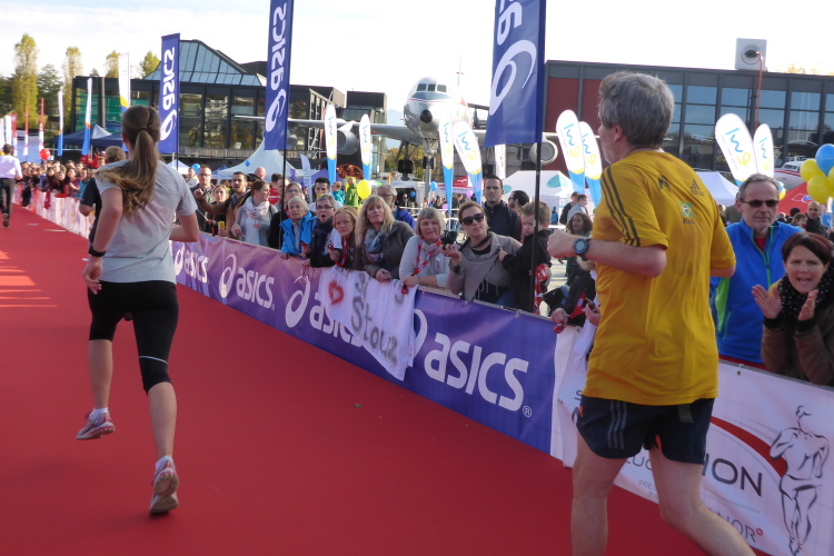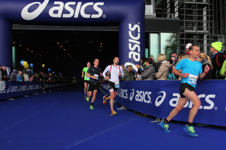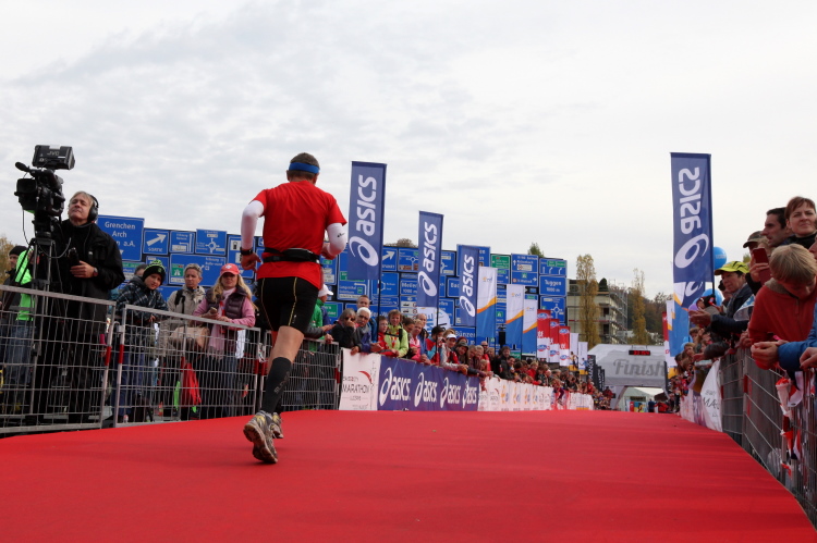 Das letzte Stück ist Genuss pur. Ich fliege dem Ziel entgegen. Die Musiker geben nochmal ihr bestes, Zuschauer und Helfer sparen nicht mit Applaus. Immer wieder kommen mir gefinishte Läufer entgegen, die mich zusätzlich anfeuern. Diesmal gibt es nur einen Weg, und der führt in Richtung Verkehrsmuseum. Das runde Gebäude ist das Ziel des Laufs. Bis zum Eingang müssen wir zunächst die Straße entlang, die gesäumt ist von Menschen. Eine scharfe Linkskurve bringt uns vor das Museum und dann hinein. Drinnen wird frenetisch Applaus gespendet. Es herrscht unglaublicher Lärm. Wir verlassen das Gebäude zum Hof hin. Hier beginnt der rote Teppich, an dessen Ende tatsächlich das Ziel auf uns wartet. Ein stimmungsvoller Zieleinlauf, wie er seinesgleichen sucht.