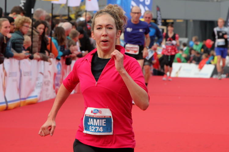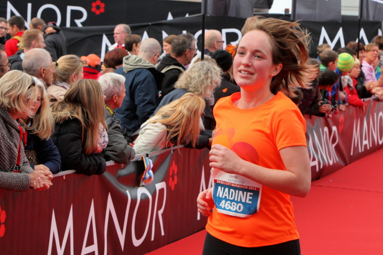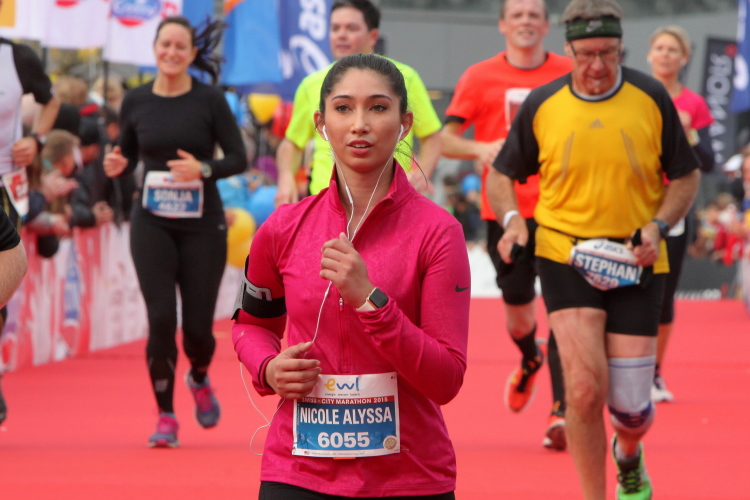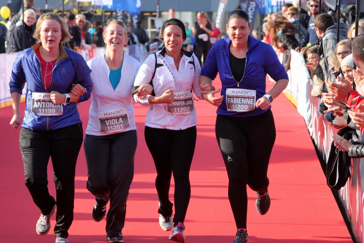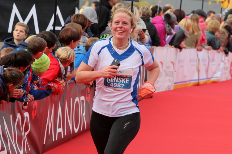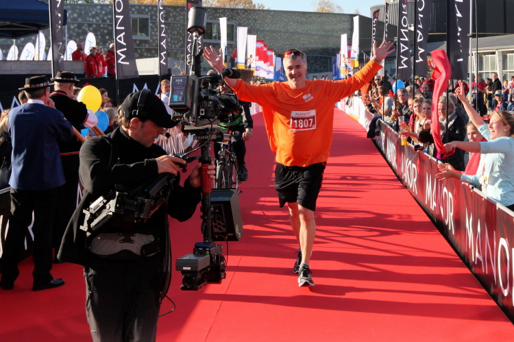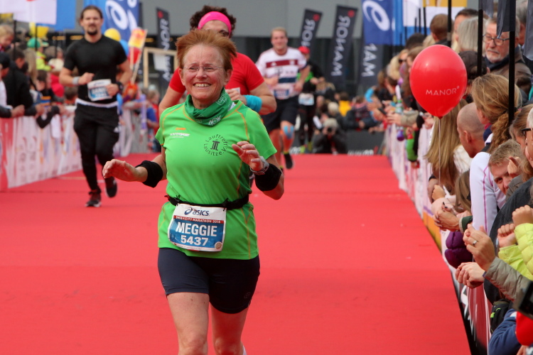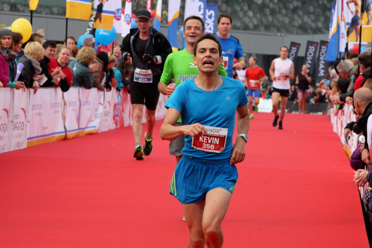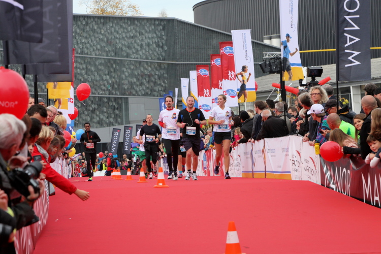 Das letzte Stück ist Genuss pur. Ich fliege dem Ziel entgegen. Die Musiker geben nochmal ihr bestes, Zuschauer und Helfer sparen nicht mit Applaus. Immer wieder kommen mir gefinishte Läufer entgegen, die mich zusätzlich anfeuern. Diesmal gibt es nur einen Weg, und der führt in Richtung Verkehrsmuseum. Das runde Gebäude ist das Ziel des Laufs. Bis zum Eingang müssen wir zunächst die Straße entlang, die gesäumt ist von Menschen. Eine scharfe Linkskurve bringt uns vor das Museum und dann hinein. Drinnen wird frenetisch Applaus gespendet. Es herrscht unglaublicher Lärm. Wir verlassen das Gebäude zum Hof hin. Hier beginnt der rote Teppich, an dessen Ende tatsächlich das Ziel auf uns wartet. Ein stimmungsvoller Zieleinlauf, wie er seinesgleichen sucht.