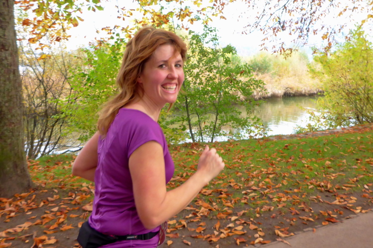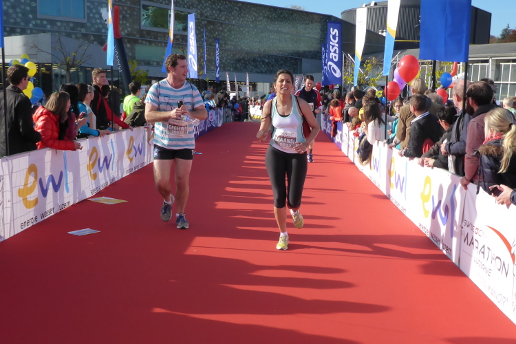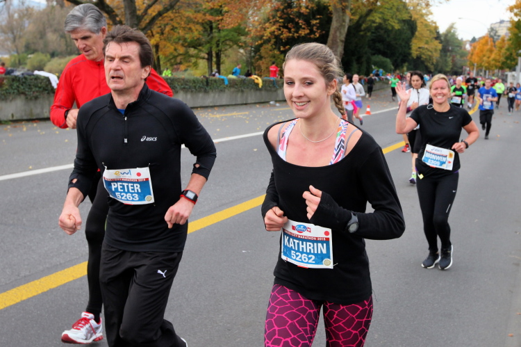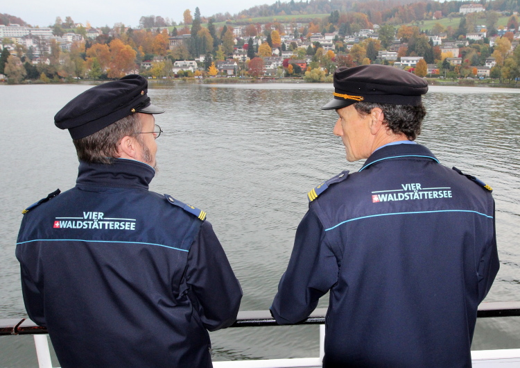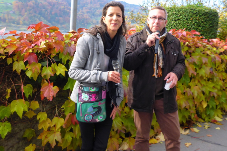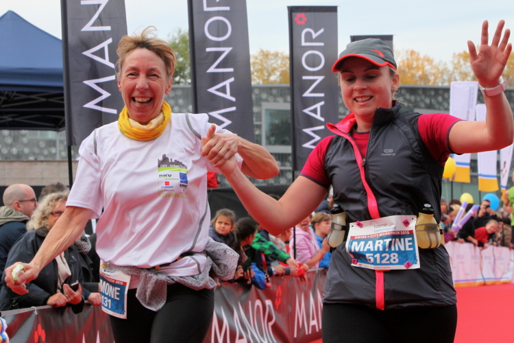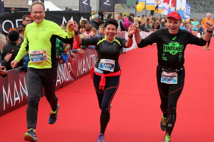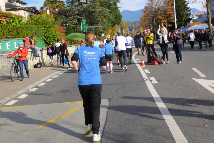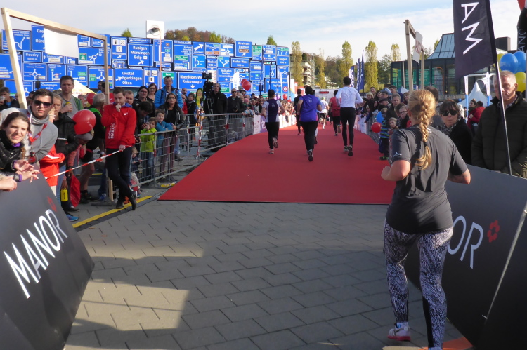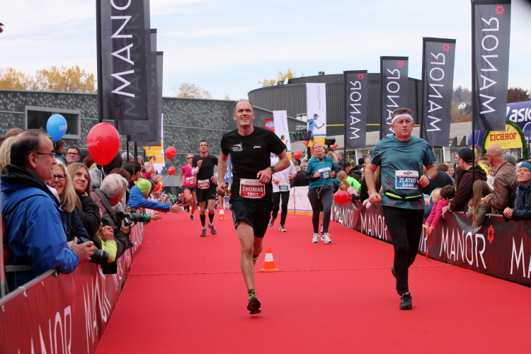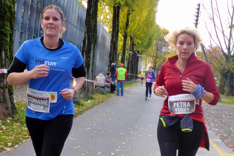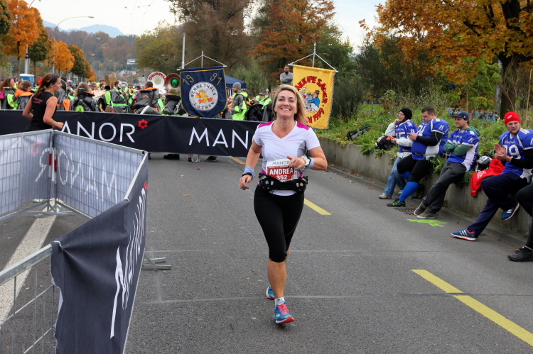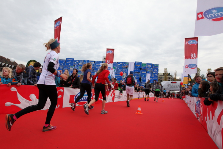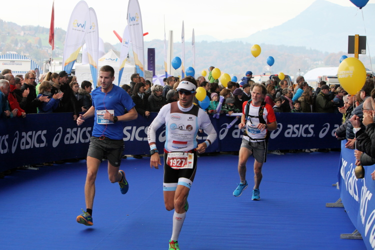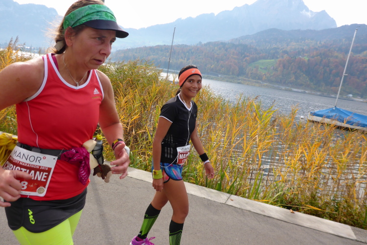 In Christiane finde ich eine Laufpartnerin mit gleichem Tempo. Zusammen erreichen wir das wunderbare Stück direkt am See und können nun unsere Begeisterung für diese tolle Strecke teilen. Mit allerlei Tröten macht eine Feiergemeinde Lärm für drei und klatscht begeistert ab. Plötzlich, als ob Petrus uns für unsere Mühen belohnen will, kommt die Sonne heraus. Auf einmal liegt die Landschaft, der See und die Berge in ganz neuem, hellen Licht. Blau strahlt der See, bunt leuchtet das Herbstlaub und die Berge zeichnen nun deutlich ihr Profil in den klaren Himmel.