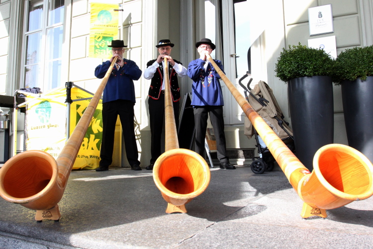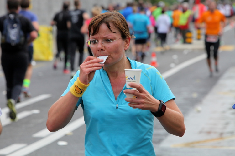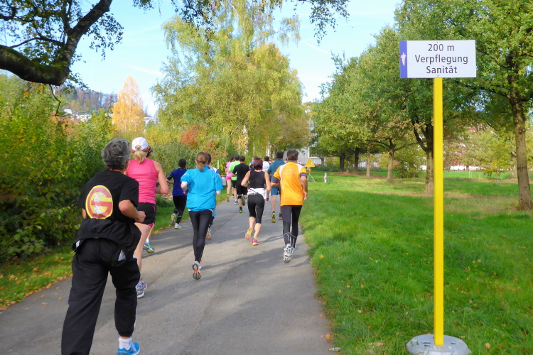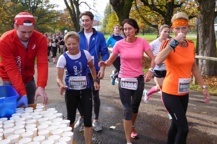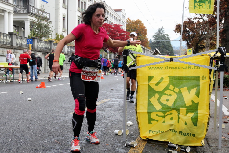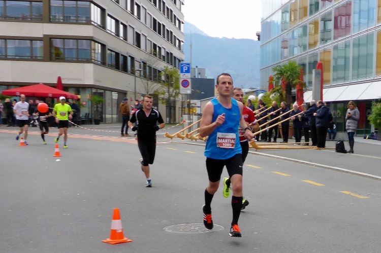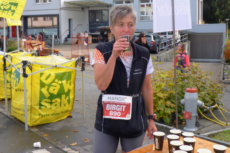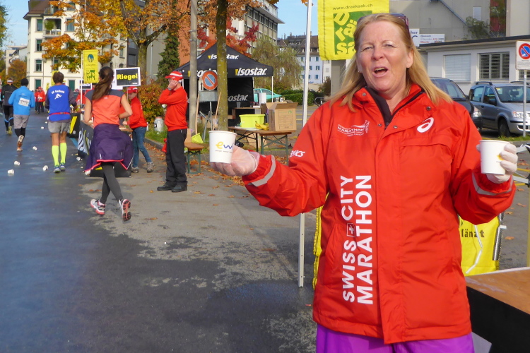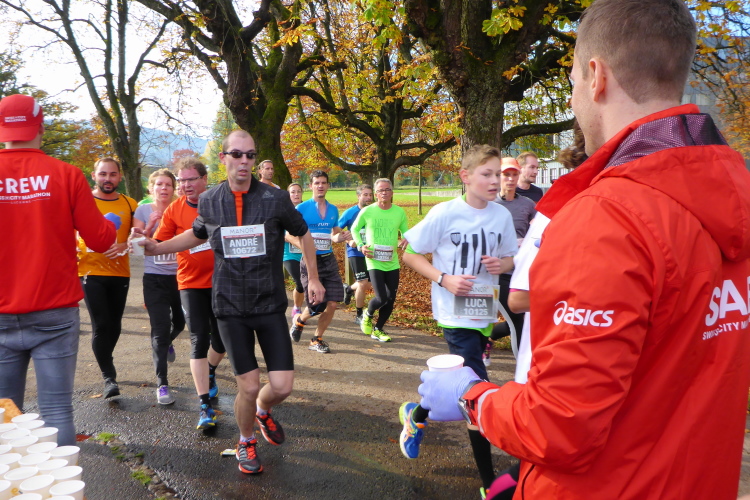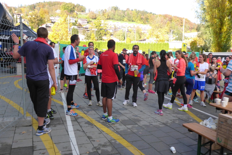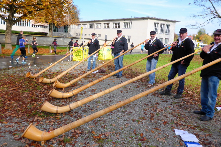 Zunächst bleibt alles ruhig. Erst als wir schon an den Gleisen des Horwer Bahnhofs entlanglaufen, kommen die Fahrräder von hinten. „Bitte rechts halten!“ Das lassen wir uns nicht zweimal sagen, und schon kommen die schnellen Hirsche von hinten angewetzt. Hinter km 35 in dem kleinen Wäldchen sind wir Marathonies dann endgültig von der Masse geschluckt. An der VP kann ich gerade noch hinter die Tische flüchten. Die Menge an Händen, die nach den Bechern greift, ist so unübersichtlich, dass die Helfer sichtlich Mühe haben, Ruhe zu bewahren. Ich verkrümele mich zu den Alphornbläsern und halte ein kurzes Schwätzchen. Vorsichtig klinke ich mich dann wieder in den Läuferfluss ein.