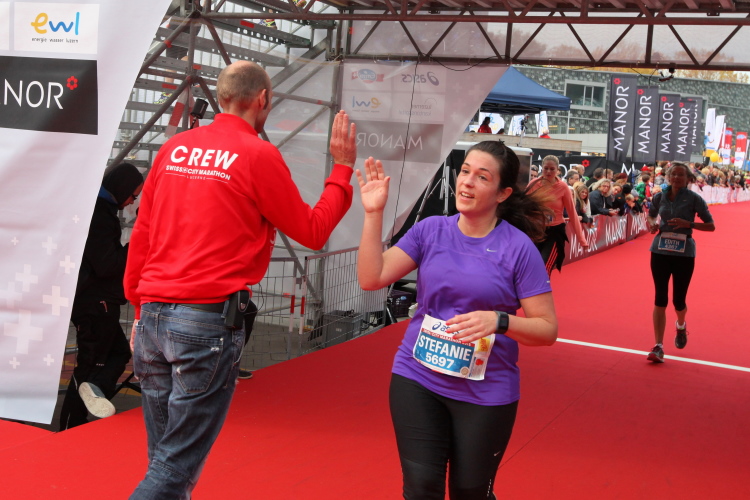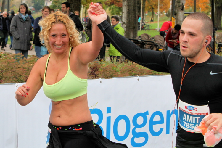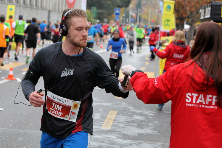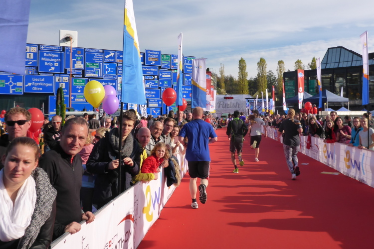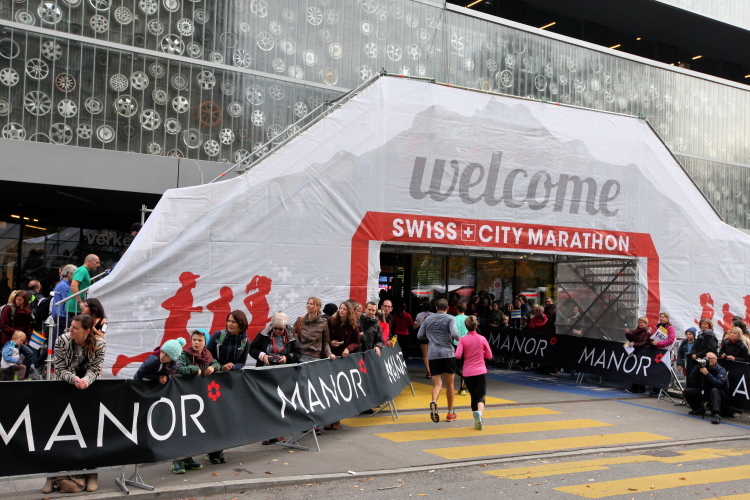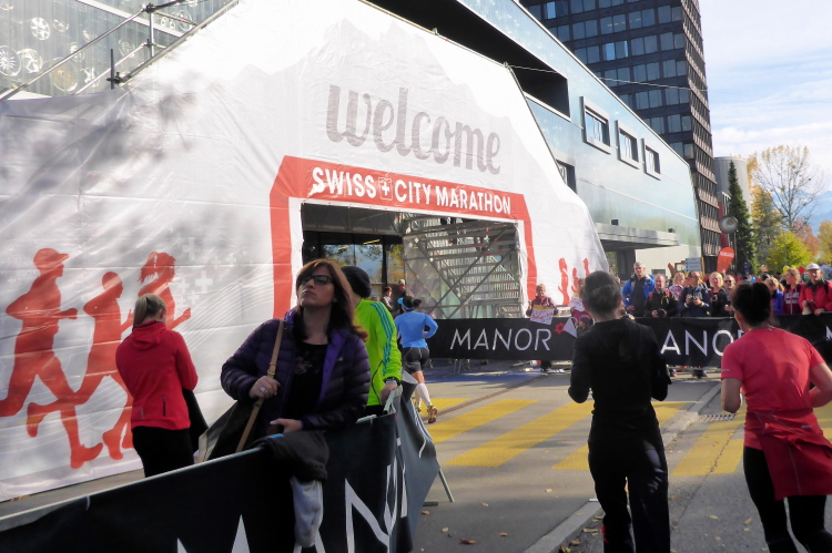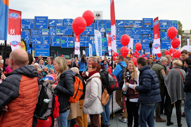 Im Ziel werden Marathonläufer nach links geführt. Hier gibt es zunächst Glückwünsche und eine Medaille. Danach wird der Chip von der Startnummer entfernt und abgegeben. Am Ausgang erhalten alle dann eine gefüllte Flasche des Sponsors mit einem Sportgetränk. Diese ist liebevoll gestaltet und mit dem Logo des Swiss City Marathons versehen. Norbert passt mich ab, sonst hätten wir uns vermutlich gar nicht gefunden. Der Platz um das Verkehrsmuseum quillt fast über von Läufern und ihren Begleitern.
