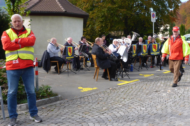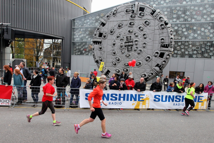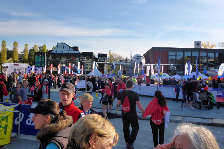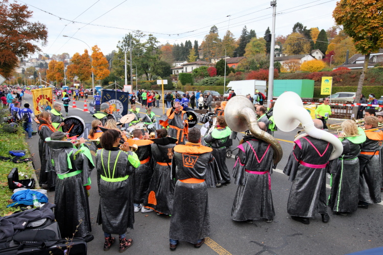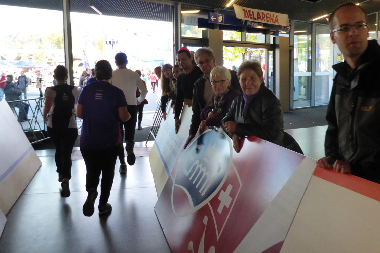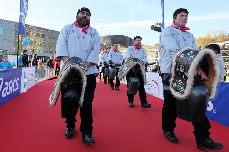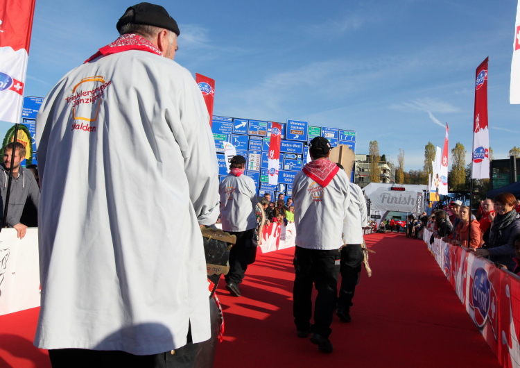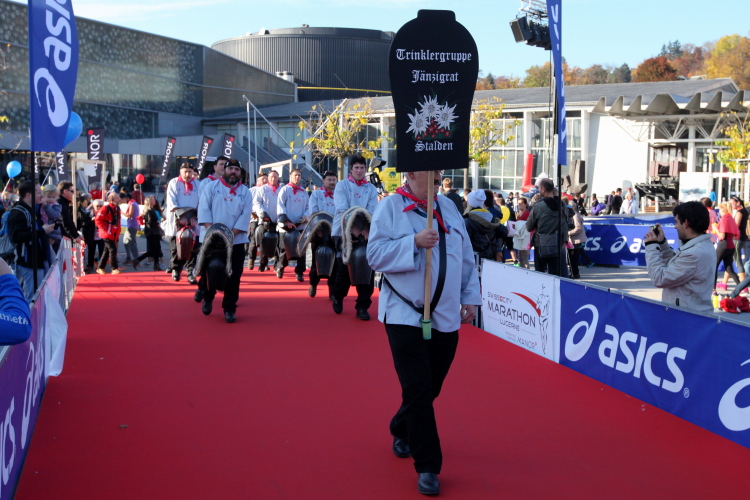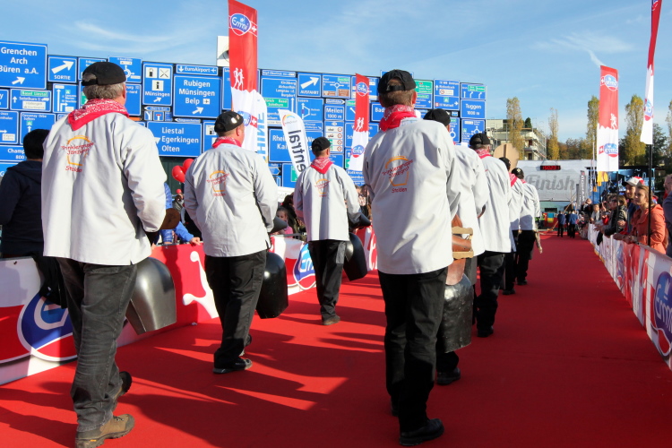 Den Gutschein für ein Erdinger lösen wir sofort ein, dann suchen wir ein ruhiges Plätzchen im Museum. Obwohl hier zum Thema Mobilität einiges geboten ist, fehlt mir für eine längere Besichtigung die Lust und die Kraft. Bevor wir das Gelände verlassen, holen wir uns das Finisher Shirt. Immer noch kommen Läufer ins Ziel. Plötzlich wird es laut. Eine Formation der Trinklergruppe Jänzigrat aus Stalden kommt anmarschiert. Als Trinkeln oder Treicheln werden großen Kuhglocken bezeichnet, die, wenn sie anhaltend geläutet werden, ein monotones, ohrenbetäubendes Geräusch verursachen. In der Schweiz begleiten solche Gruppen Nikolaus und Knecht Ruprecht. Heute besteht ihre Aufgabe darin, das Ziel zu sperren. Punkt 15 Uhr ist Zielschluss.
