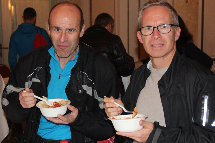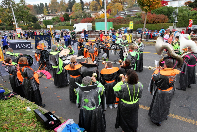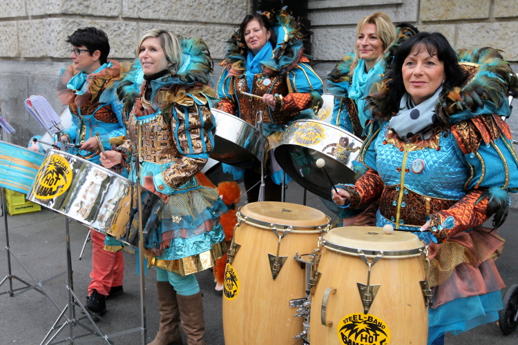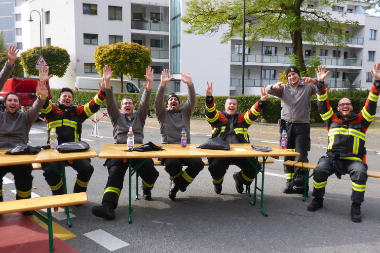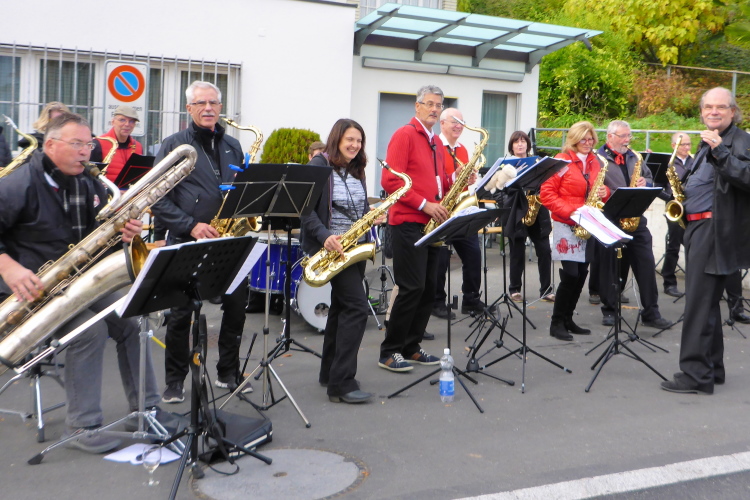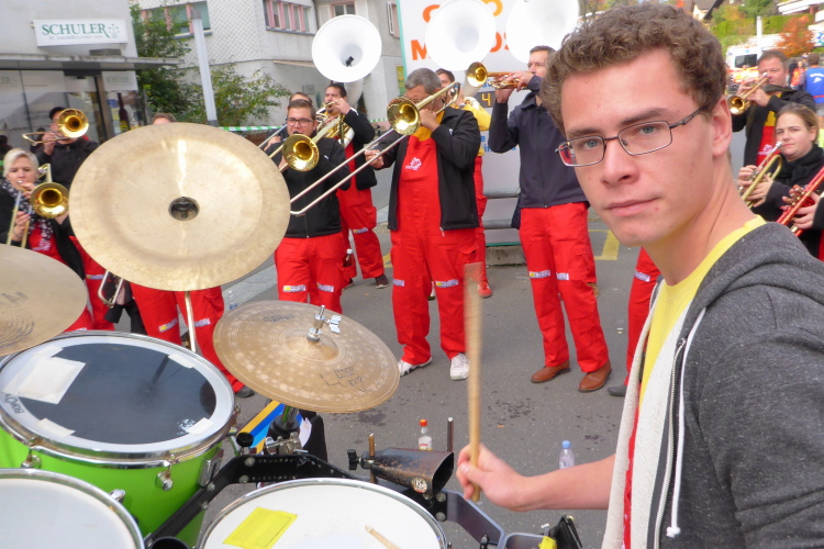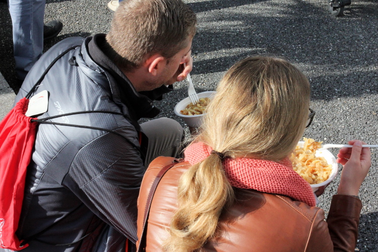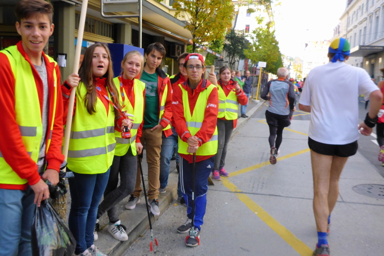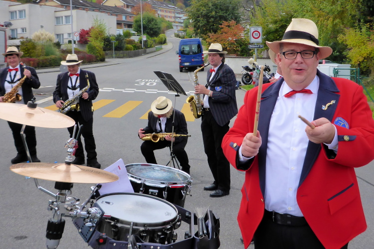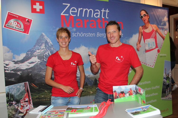 Den Gutschein für ein Erdinger lösen wir sofort ein, dann suchen wir ein ruhiges Plätzchen im Museum. Obwohl hier zum Thema Mobilität einiges geboten ist, fehlt mir für eine längere Besichtigung die Lust und die Kraft. Bevor wir das Gelände verlassen, holen wir uns das Finisher Shirt. Immer noch kommen Läufer ins Ziel. Plötzlich wird es laut. Eine Formation der Trinklergruppe Jänzigrat aus Stalden kommt anmarschiert. Als Trinkeln oder Treicheln werden großen Kuhglocken bezeichnet, die, wenn sie anhaltend geläutet werden, ein monotones, ohrenbetäubendes Geräusch verursachen. In der Schweiz begleiten solche Gruppen Nikolaus und Knecht Ruprecht. Heute besteht ihre Aufgabe darin, das Ziel zu sperren. Punkt 15 Uhr ist Zielschluss.