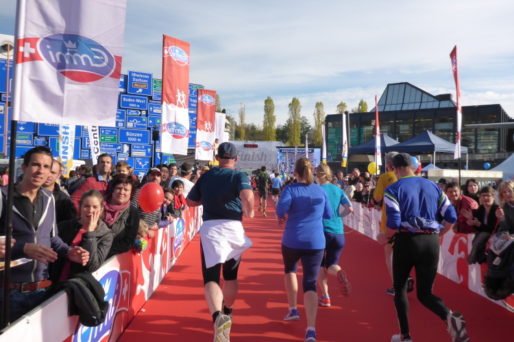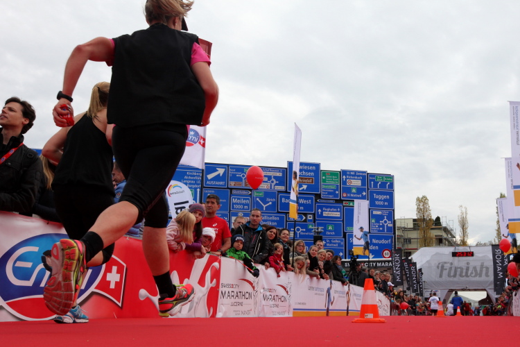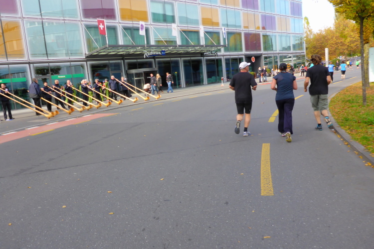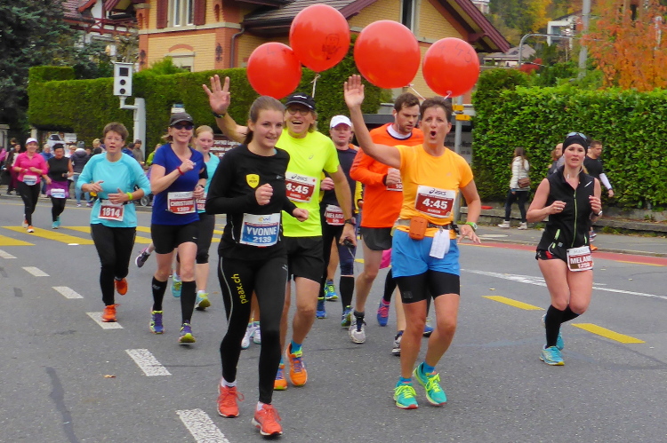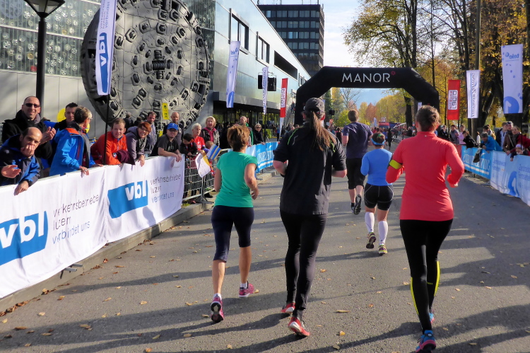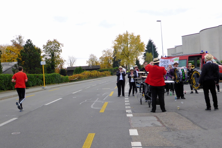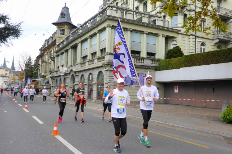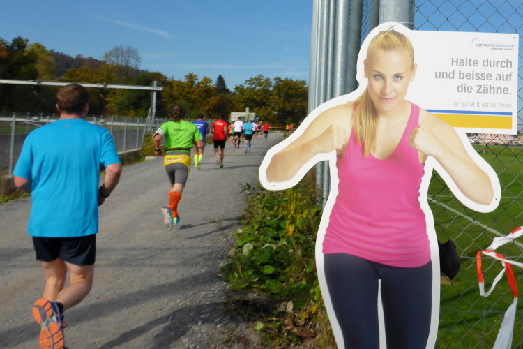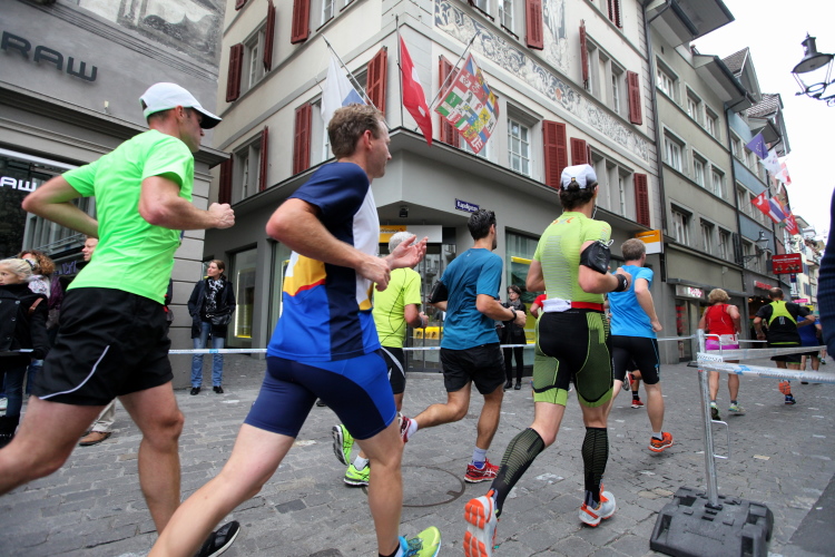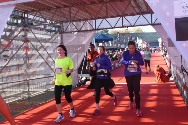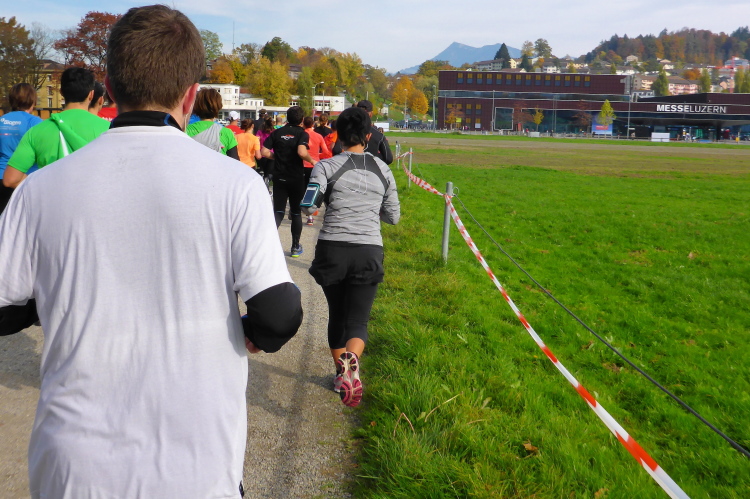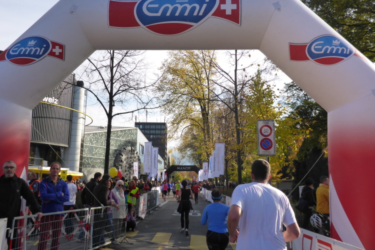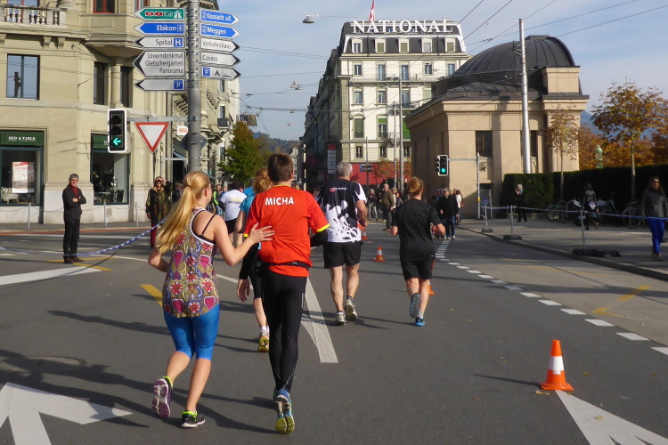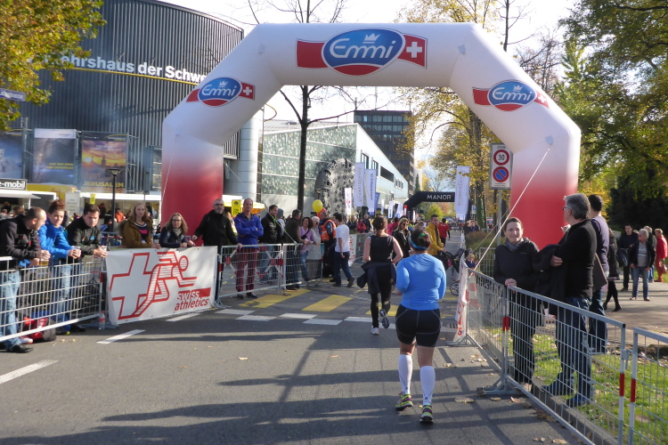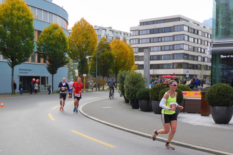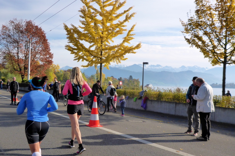 Auch in Horw sind noch etliche Zuschauer am Straßenrand. Als wir auf die Hauptstraße einbiegen, sehe ich im Augenwinkel etwas was mich stutzen lässt: In einer Seitenstraße ist ein Startbogen aufgebaut und darunter sind bestimmt hundert Leute versammelt. Gleichzeitig höre ich den Sprecher. Während ich unter dem Applaus des Publikums die Straße entlang laufe, wird der 5 Meilen Lauf gestartet. D. h., die schnellen Kurzstreckler und wir haben bis ins Ziel den gleichen Weg. Oh je, hoffentlich fegen sie uns nicht von der Straße. Auch Christiane ist besorgt.