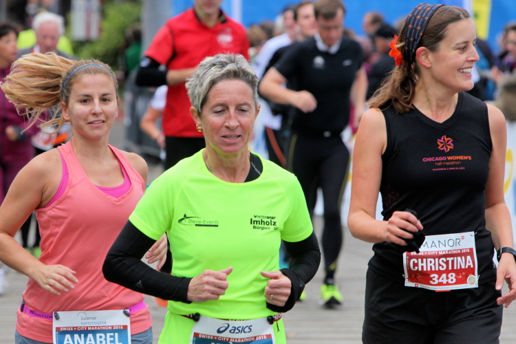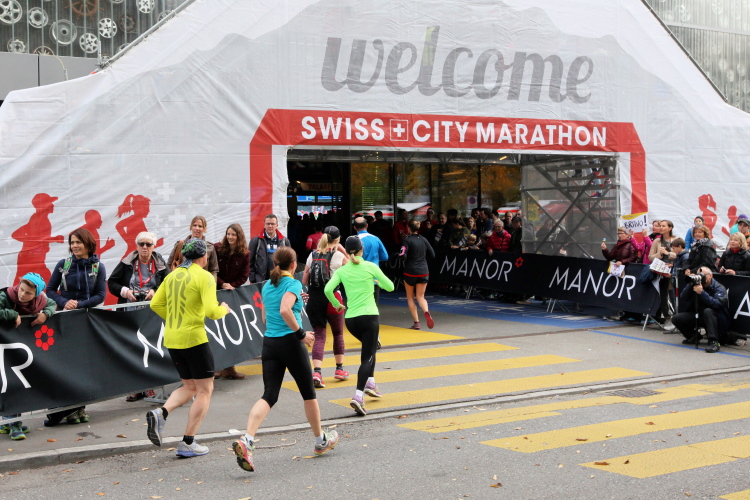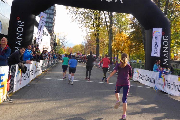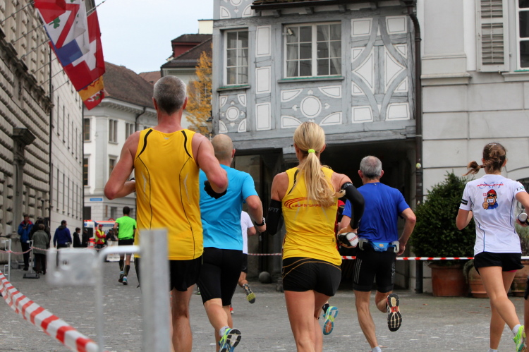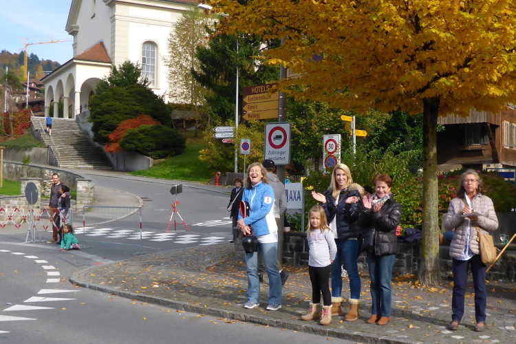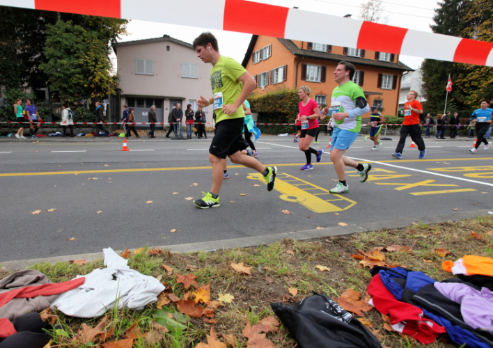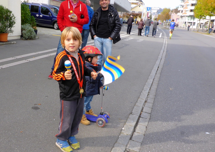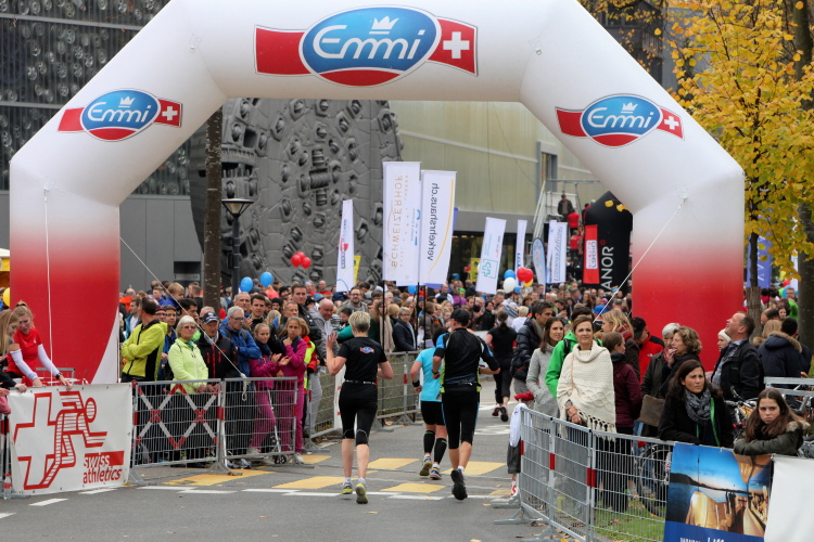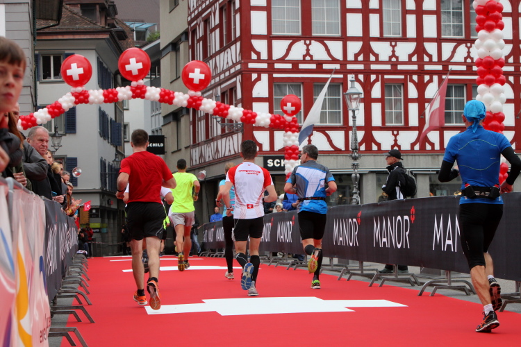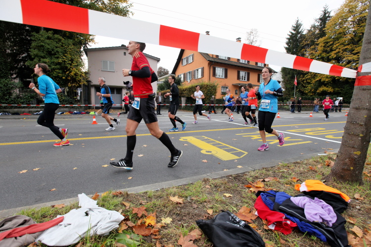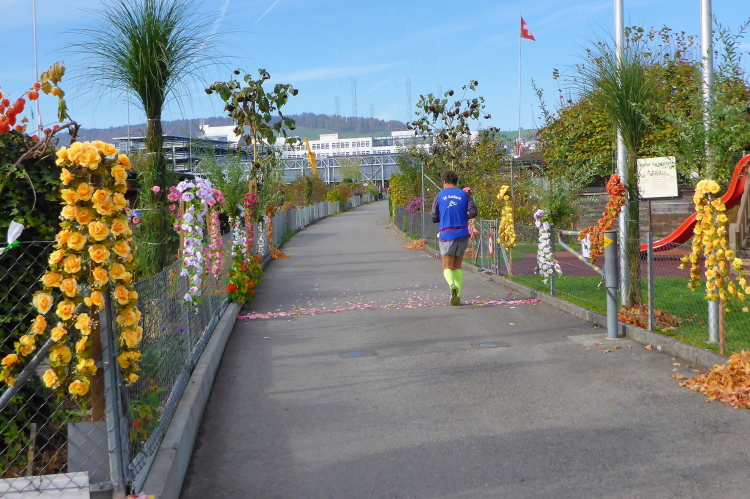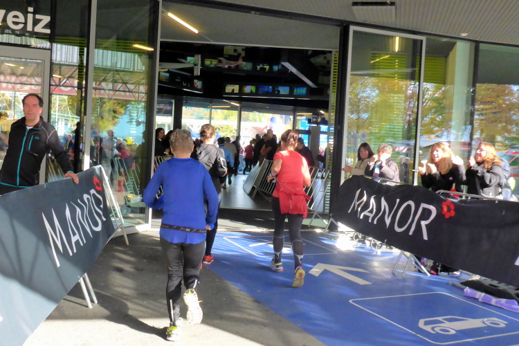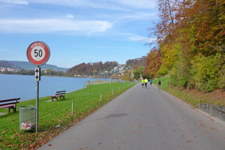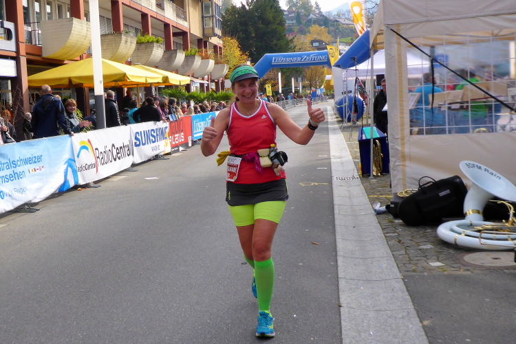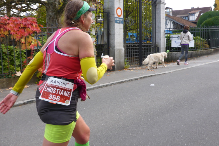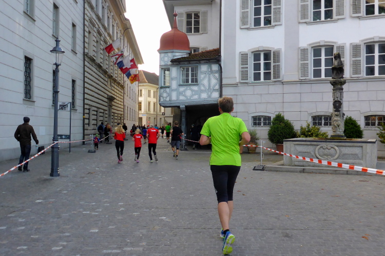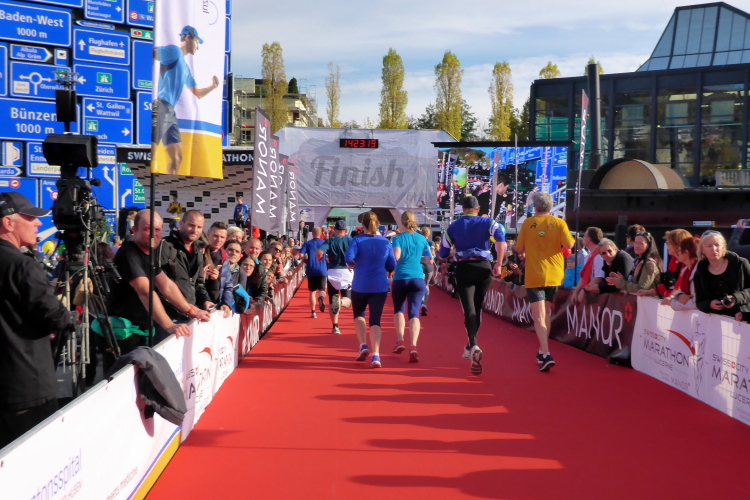 Auch in Horw sind noch etliche Zuschauer am Straßenrand. Als wir auf die Hauptstraße einbiegen, sehe ich im Augenwinkel etwas was mich stutzen lässt: In einer Seitenstraße ist ein Startbogen aufgebaut und darunter sind bestimmt hundert Leute versammelt. Gleichzeitig höre ich den Sprecher. Während ich unter dem Applaus des Publikums die Straße entlang laufe, wird der 5 Meilen Lauf gestartet. D. h., die schnellen Kurzstreckler und wir haben bis ins Ziel den gleichen Weg. Oh je, hoffentlich fegen sie uns nicht von der Straße. Auch Christiane ist besorgt.