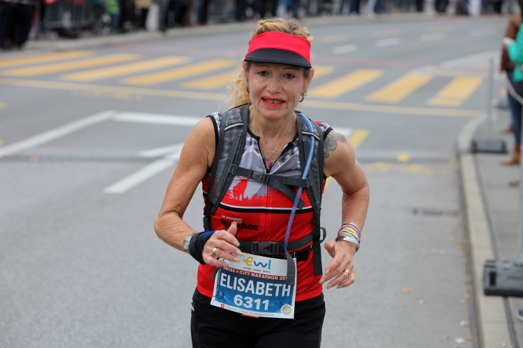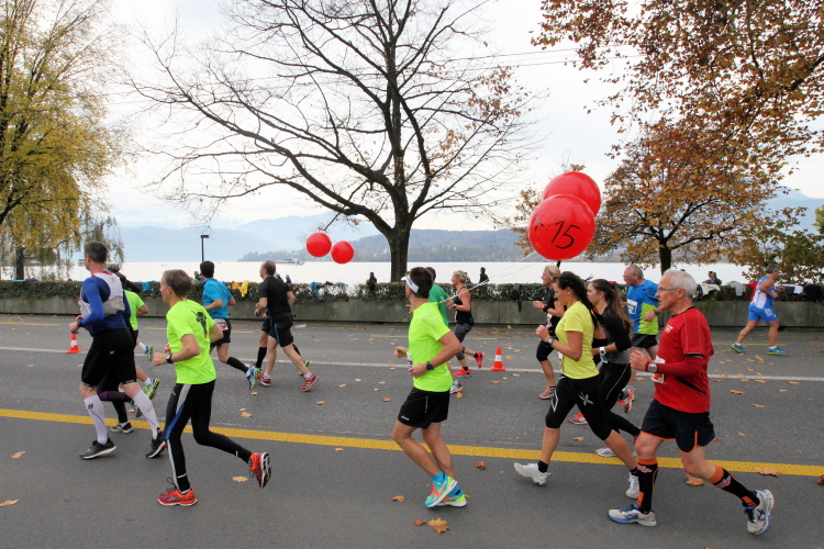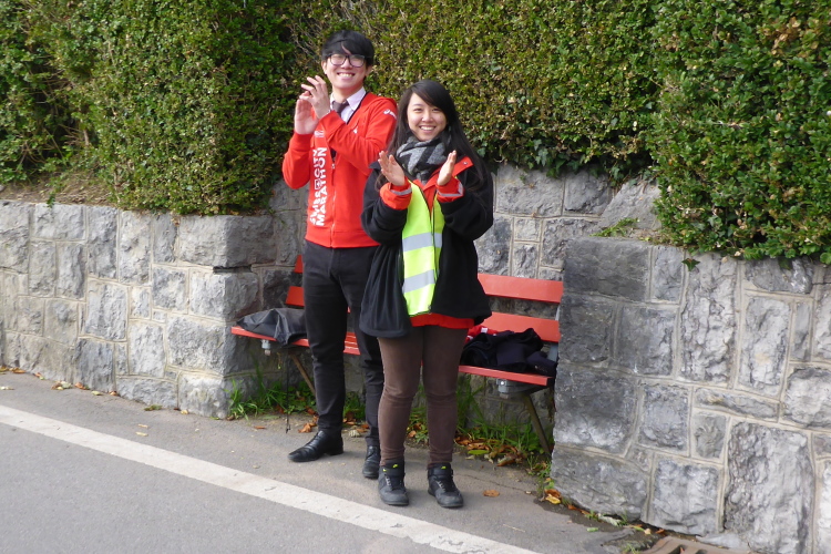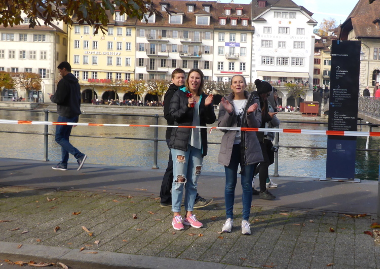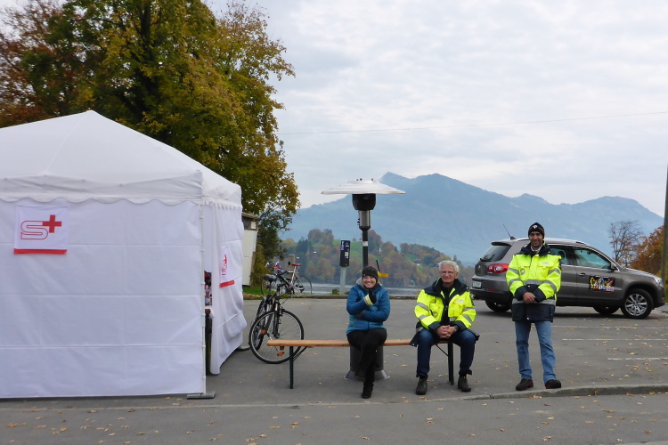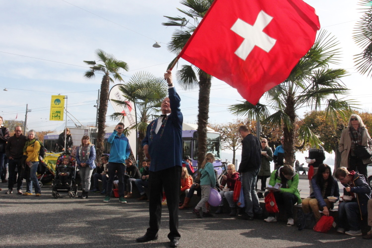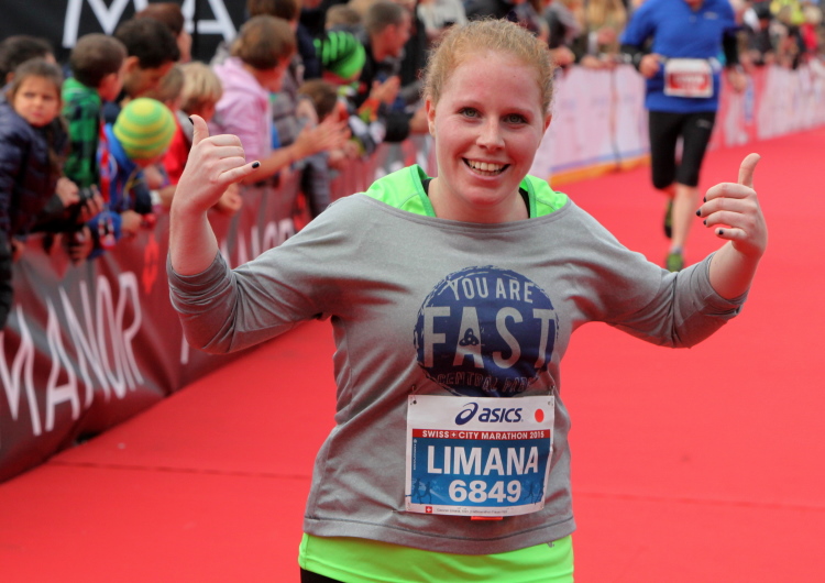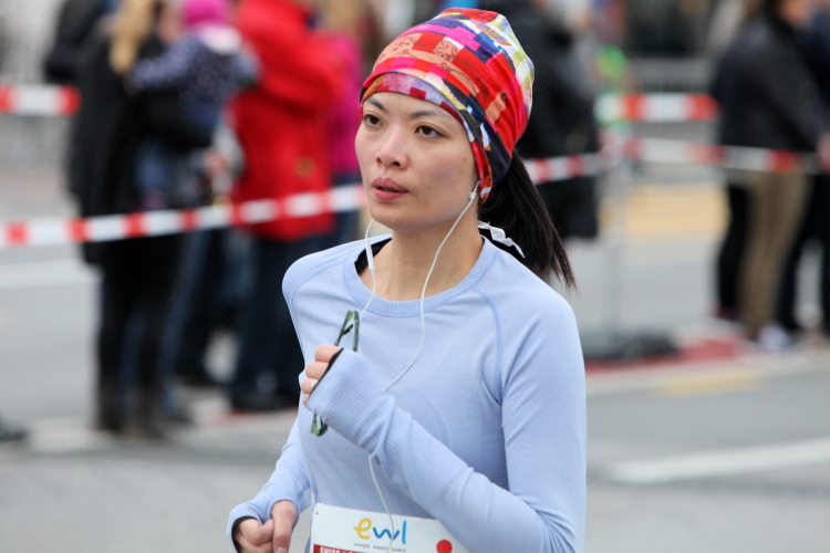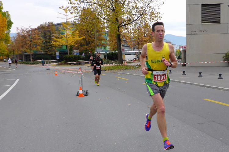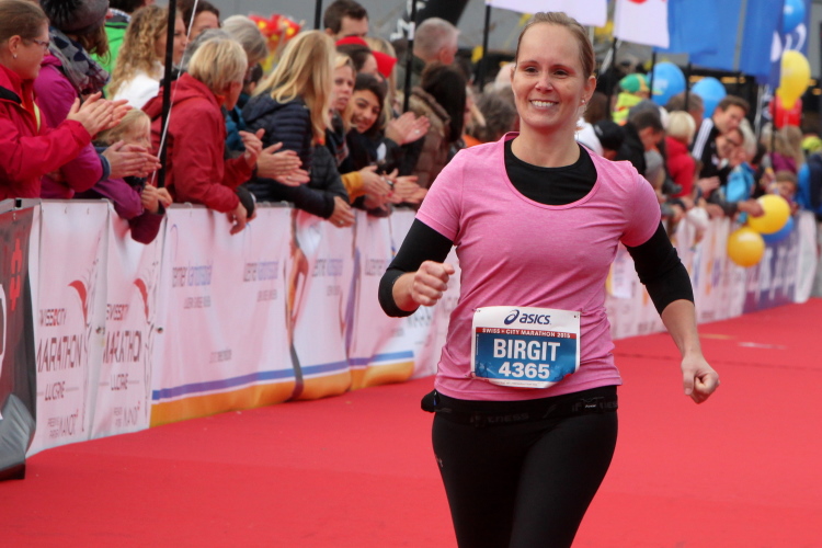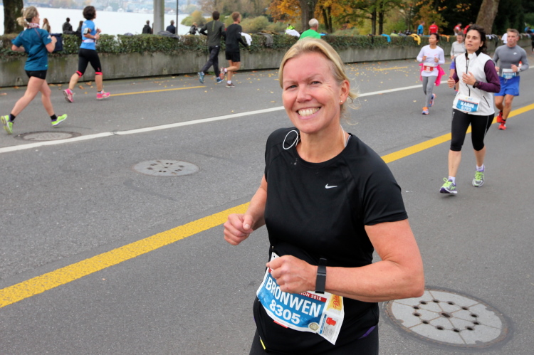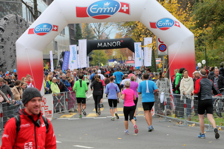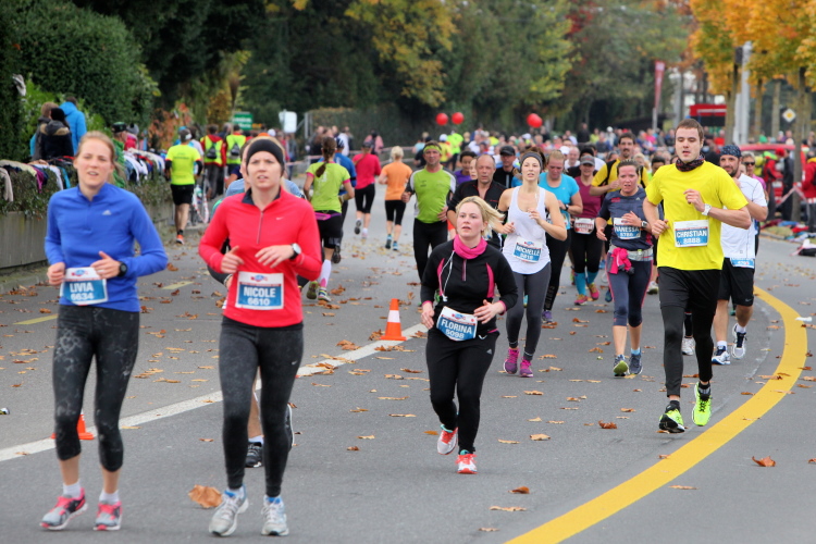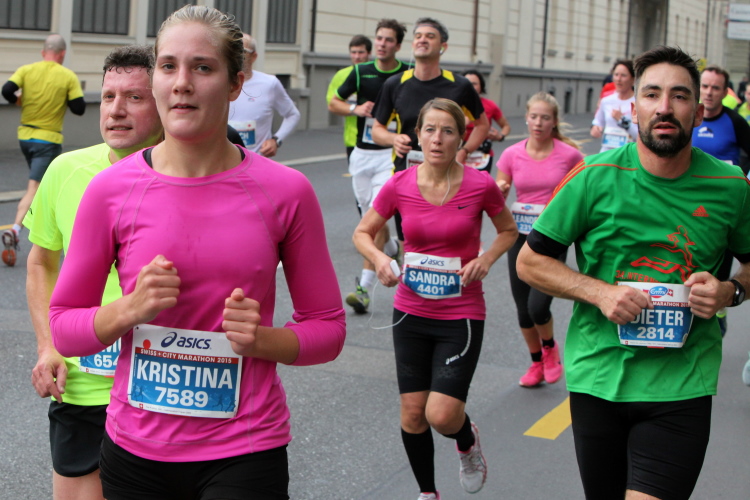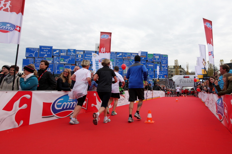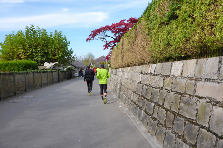 Auch in Horw sind noch etliche Zuschauer am Straßenrand. Als wir auf die Hauptstraße einbiegen, sehe ich im Augenwinkel etwas was mich stutzen lässt: In einer Seitenstraße ist ein Startbogen aufgebaut und darunter sind bestimmt hundert Leute versammelt. Gleichzeitig höre ich den Sprecher. Während ich unter dem Applaus des Publikums die Straße entlang laufe, wird der 5 Meilen Lauf gestartet. D. h., die schnellen Kurzstreckler und wir haben bis ins Ziel den gleichen Weg. Oh je, hoffentlich fegen sie uns nicht von der Straße. Auch Christiane ist besorgt.