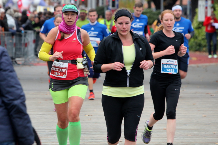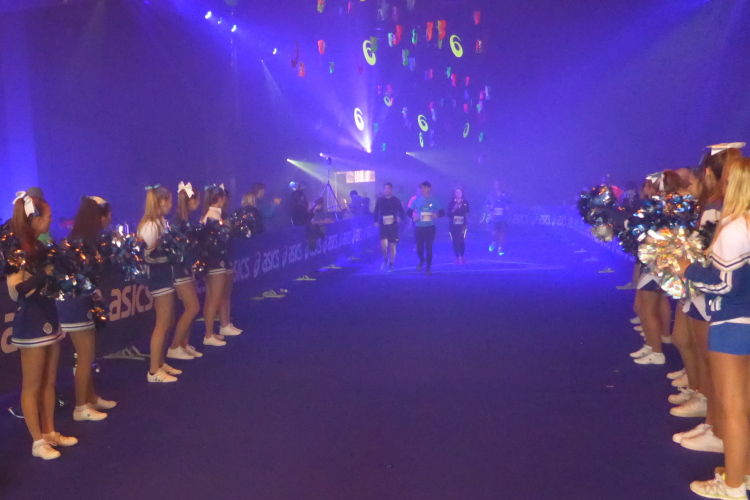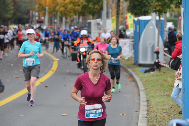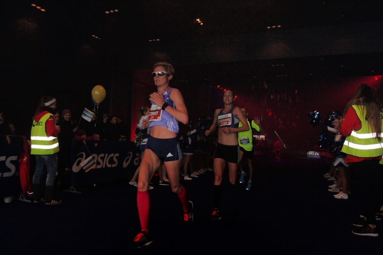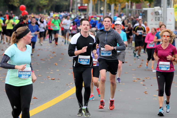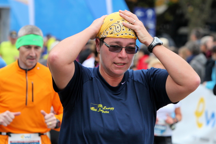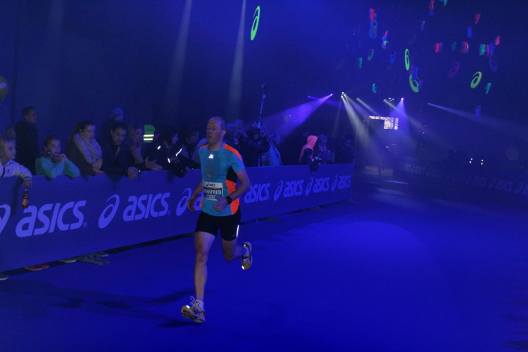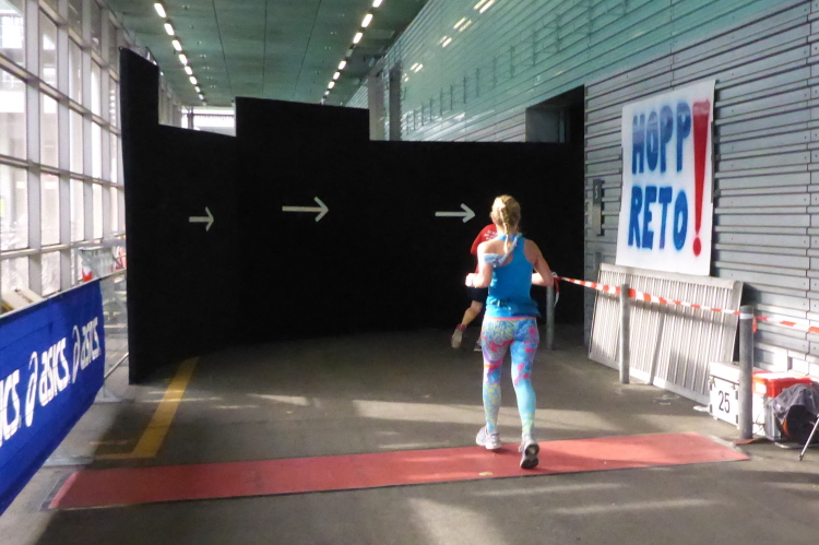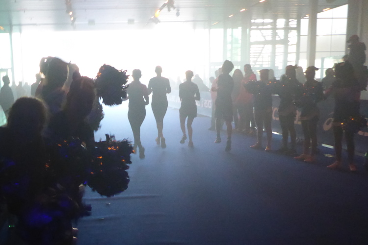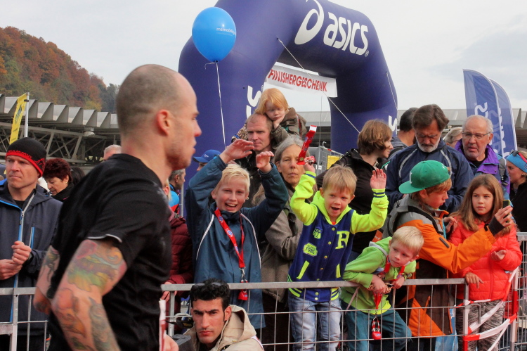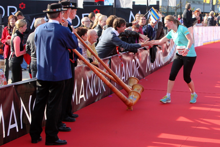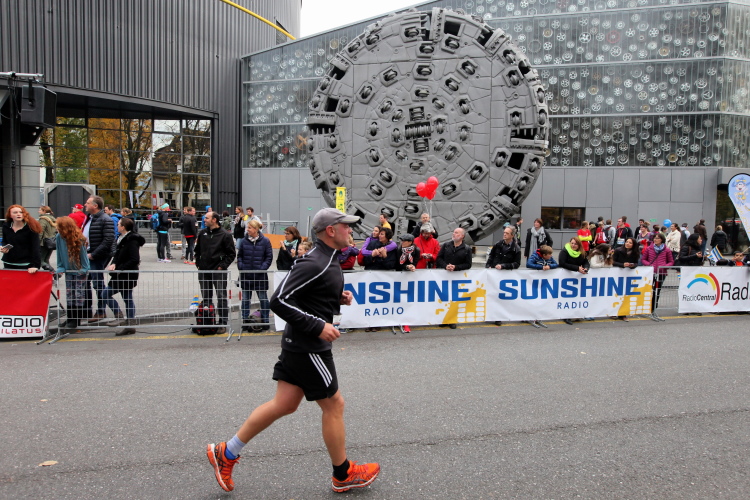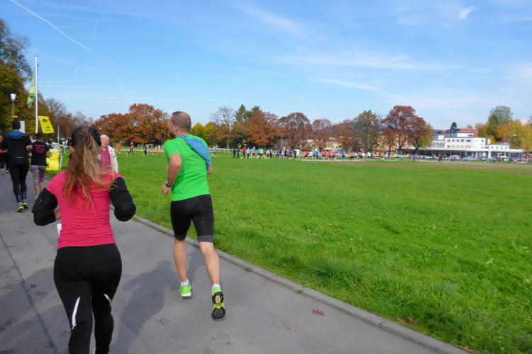 Wo vorhin noch die Strecke geteilt war, ist nun von Gegenverkehr nichts mehr zu sehen. Da ja die Marathonwende um 12 Uhr geschlossen wird, kann auch keiner mehr kommen. Wir biegen ins KKL ein. Hier ist immer noch Disko. Eigentlich ist nun mehr los, als vorhin. Die Läufer sind begeistert und feiern zusammen mit den Zuschauern. Wieder entlassen uns die Chearleader nach draußen. Dort ist ein Sprecher unterwegs, der das Publikum motiviert. Er scheint es speziell auf Marathonläufer abgesehen zu haben. Sofort hält er mir das Mikro vor die Nase. Er will wissen, wie ich die Strecke finde, ob ich schon einmal hier war, was ich alles erlebt hätte und so weiter. Dann endlich entlässt er mich. Voller Adrenalin laufe ich schneller denn je.