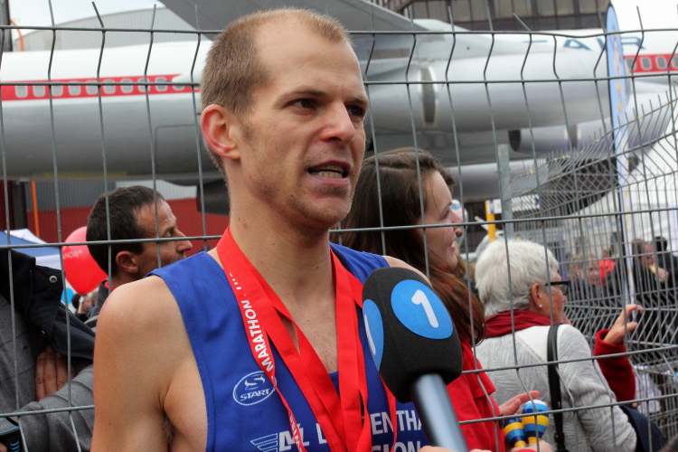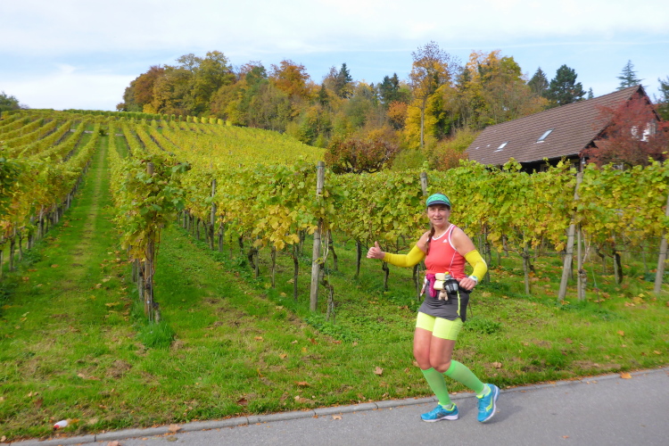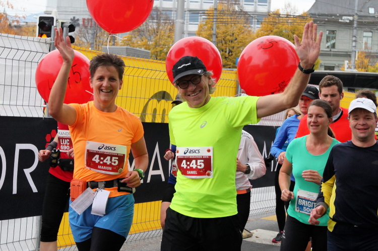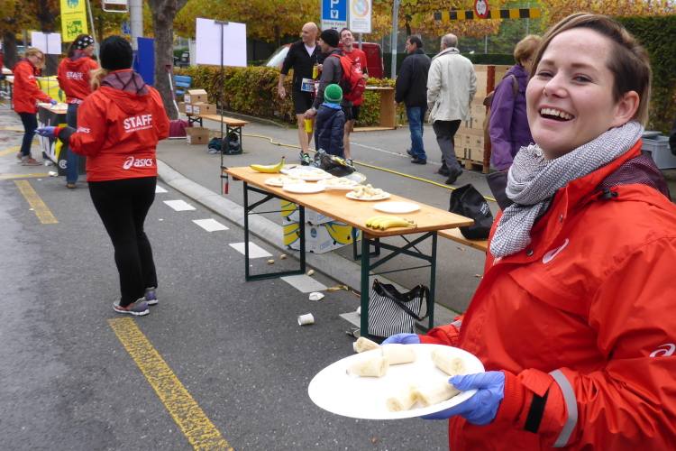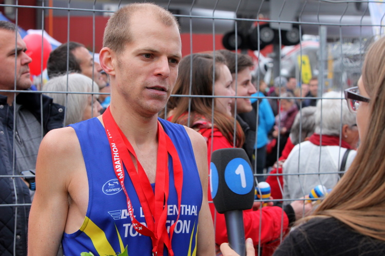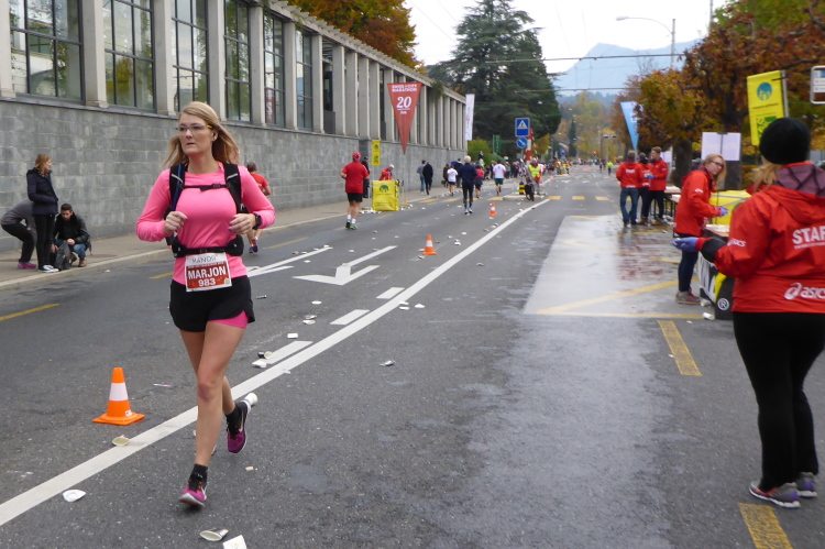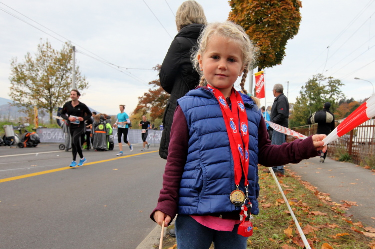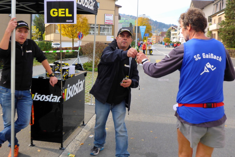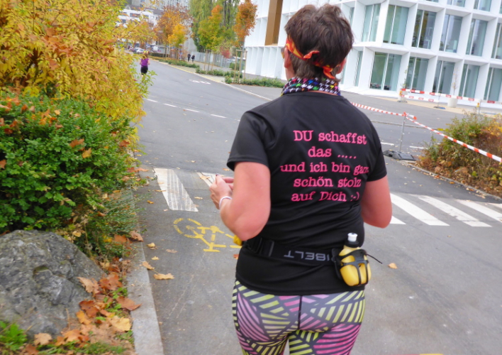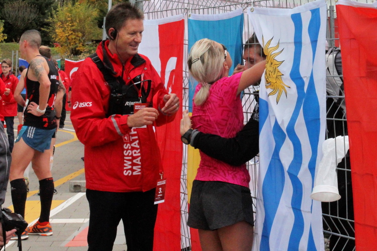 Gerade will ich weiter, da kommt mir die führende Marathonläuferin Conny Bertold entgegen und läuft einem ungefährdeten Sieg entgegen. Dicht gefolgt von Daniel Steiner, Schweizer Marathon4you-Kollege, der aber die zweite Runde erst noch laufen muss. Als Einheimischer ist es ihm eine Freude, den Pacer für 4h45 zu machen und viele Läufer ins Ziel zu führen.