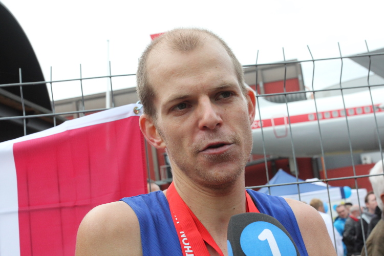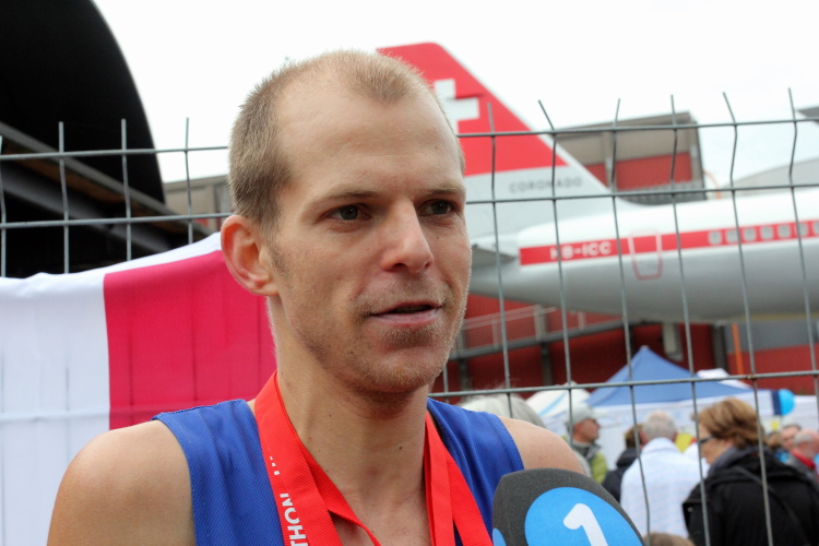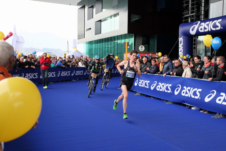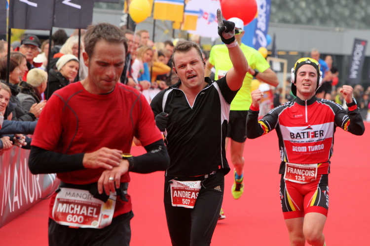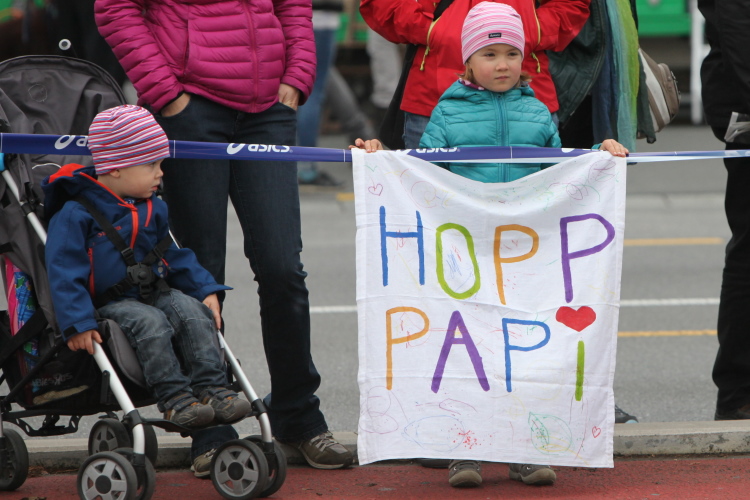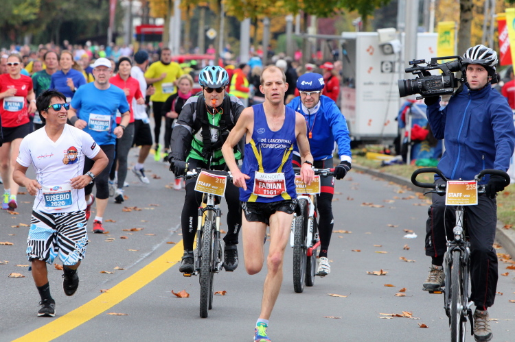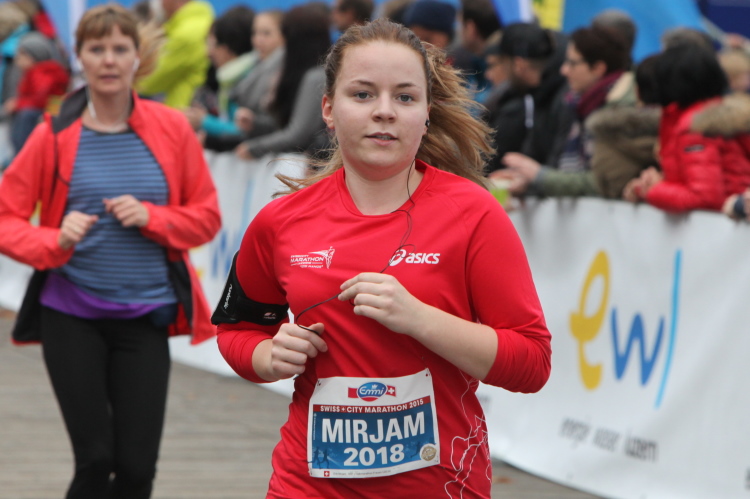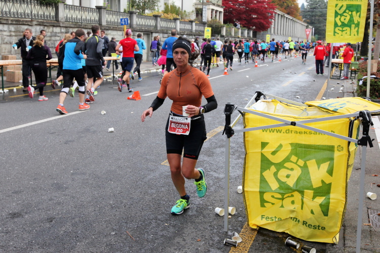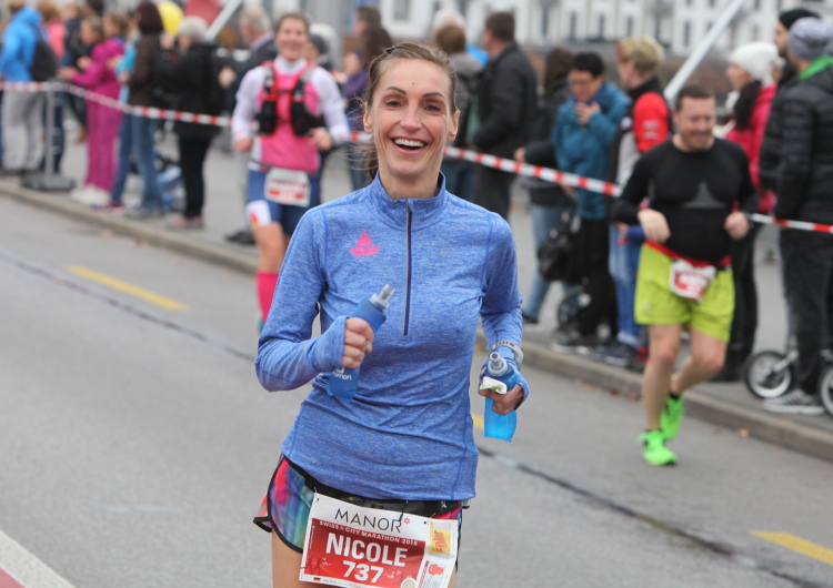 Gerade will ich weiter, da kommt mir die führende Marathonläuferin Conny Bertold entgegen und läuft einem ungefährdeten Sieg entgegen. Dicht gefolgt von Daniel Steiner, Schweizer Marathon4you-Kollege, der aber die zweite Runde erst noch laufen muss. Als Einheimischer ist es ihm eine Freude, den Pacer für 4h45 zu machen und viele Läufer ins Ziel zu führen.