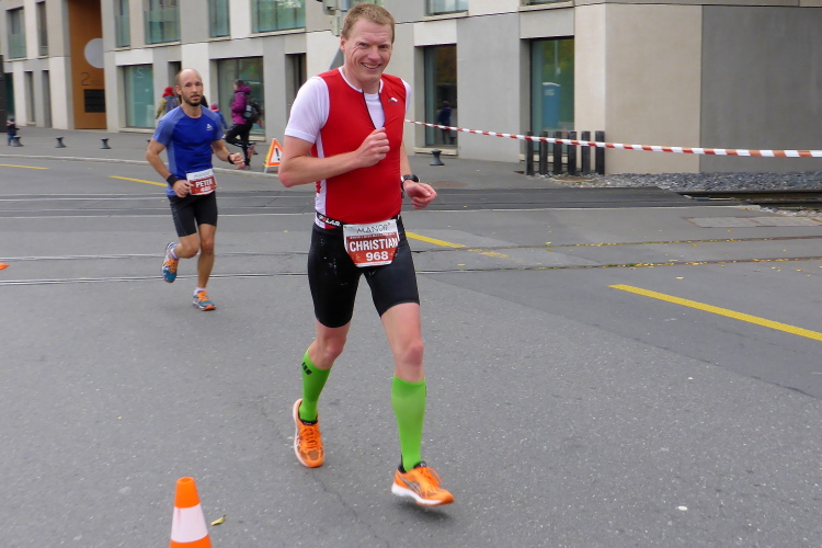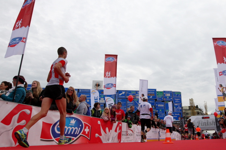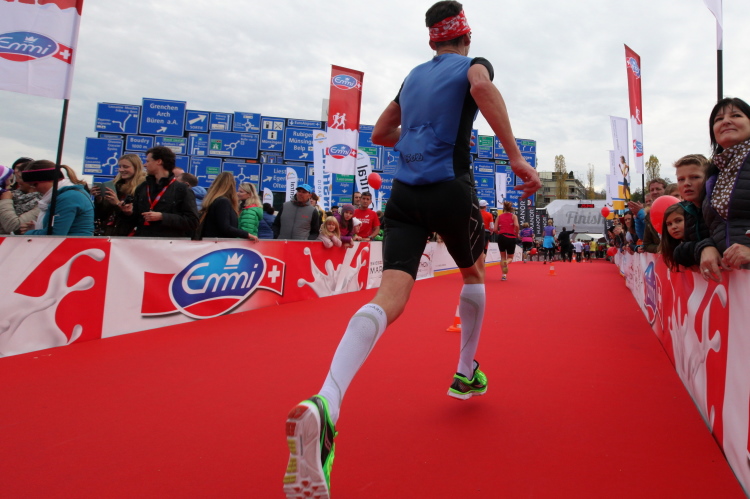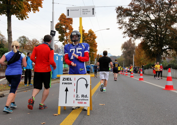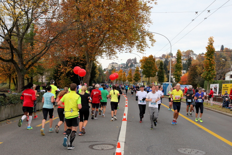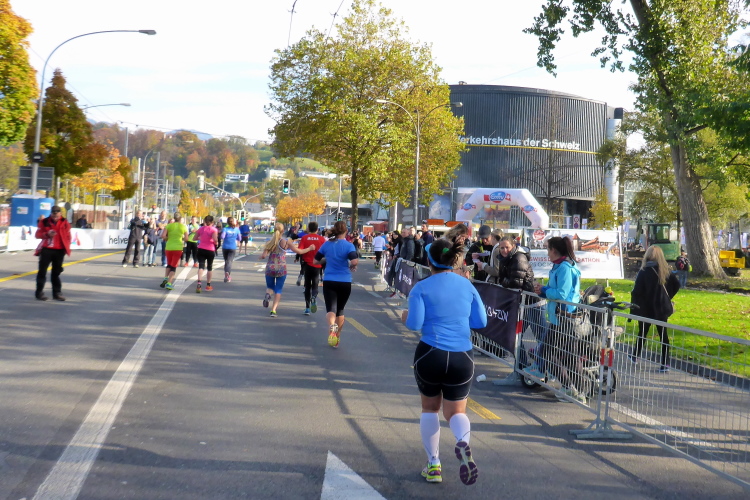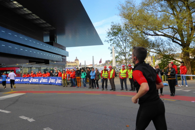 Dann die Wende. Die entgegenkommenden Halbmarathonläufer und die scheinbar immer noch nicht müden Guggenmusiker machen die Strecke bis zum Schwanenplatz kurzweilig. Dann merkt man aber, dass es auf der Strecke ruhiger wird. Umso mehr genieße ich den Zuschauerhotspot am Bahnhof und dem KKL. Ungefähr bei km 22 kommt es dann zur endgültigen Streckentrennung. Ich sehe noch vereinzelte Läufer vor mir, komme aber nicht so recht heran. Natürlich sind auch noch ziemlich viele Zuschauer an der Strecke. Es sind unentwegte Marathonenthusiasten, die den Namen der Läufer von der Startnummer ablesen und jeden einzelnen persönlich anfeuern. Das motiviert nicht nur mich ungemein.