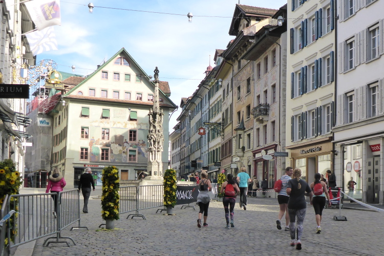 Ein Marathontor bringt uns aus der Altstadt hinaus erneut auf den Schwanenplatz. Nun wird klar, warum in der Altstadt relativ wenig Leute stehen. Alle sind hier an dieser strategisch günstigen Stelle, wo wir wieder auf entgegenkommende Läufer treffen. Gleichzeitig wird auf der Showbühne getanzt. Es ist also für die Zuschauer doppelt etwas geboten. Ab jetzt kennen wir die Strecke aus der Gegenrichtung. Die Aussicht ist aber eine ganz andere: wir laufen direkt auf die Hofkirche zu. Das imposante Bauwerk aus der Spätrennaissance ist ein Postkartenmotiv schlechthin und in seiner Symetrie auch von weitem eine Augenweide. Die Fassade ist grob in drei Teile geteilt: das Mittelstück mit dem Torbogen, dem Staatswappen und den beiden Heiligen Leodegar und Mauritius (die Kirche heißt ja auch St. Leodegar im Hof) und den beiden mittelalterlichen 69 m hohen Türmen. Bei genauem Hinsehen kann man auf dem einen Turm eine goldene Kugel mit einem Lilienkreuz und auf dem anderen einen Windanzeiger mit einem Hahn erkennen.