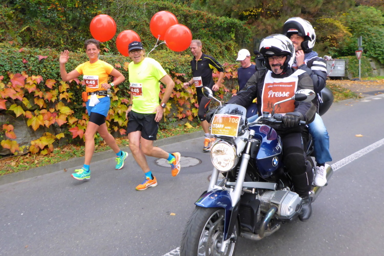 Auch die Musikkapellen spielen unentwegt, was vor allem an den Steigungen sehr hilfreich ist. Schon die ganze Zeit freue ich mich auf das lange Gefälle nach Kastanienbaum hinunter. Gerade in diesem tollen Abschnitt schlägt gnadenlos ein Krampf in meinem linken Oberschenkel zu. Ich muss tatsächlich stehen bleiben. Hier kommt die Gruppe um Daniel vorbei, im Schlepptau ein Motorrad mit Presselleuten an Bord. Er gibt doch tatsächlich während des Laufs ein Interview. Leider kann ich nicht mithalten, aber langsam geht es weiter.
