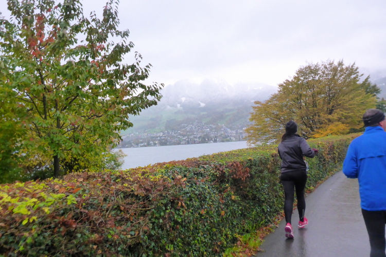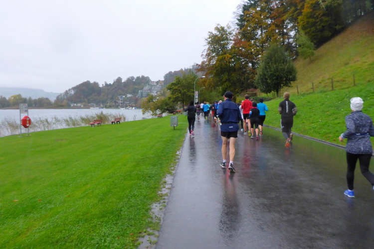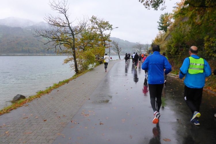 Bei km 7 laufen wir komplett im Grünen mit dem Luzerner Hausberg Pilatus im Hintergrund. Der Gipfel ist, wie gesagt, in Wolken, auf halber Höhe liegt schon Schnee. Vom See ab führt die steilste Zahnradbahn der Welt auf 2.132 m Höhe. In dieser wunderbaren Natur, direkt an der Strecke spielen Musiker unter einem Partyzelt. Wir ignorieren den Regen und geben Applaus.