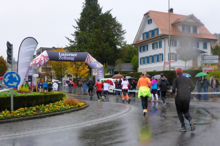 Am Ortseingang von Horw gibt es erneut eine LaOla-Welle. Die Leute wissen, wie man müde Läufer aufmuntert. Auch etwas weiter sind noch einige Zuschauer am Straßenrand. Als ich auf die Hauptstraße einbiege, sehe ich bereits die 10 km Läufer, die hier gestartet sind, auf unsere Laufstrecke einbiegen. Sofort bin ich mitten im Pulk. Aber die Zuschauer können unterscheiden, wer Marathonläufer ist. Sobald ich ankomme, werde ich frenetisch angefeuert. Sogar der Moderator an den beiden Marathontoren stellt mich ausführlich vor. Da kann man einfach nicht langsamer werden.