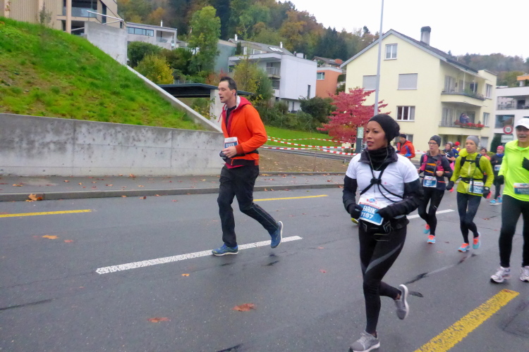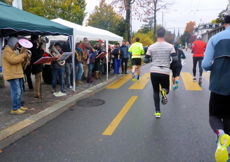 Luzerner Vorortstraßen sind unser nächstes Ziel begleitet von Musik und Publikum. Plötzlich kommt das Führungsfahrzeug und etliche Fahrräder von hinten und bitten die Läufer sich rechts zu halten. Sie kündigen den führenden Marathonläufer an. Mit langen Schritten und hochkonzentriert flitzt der Frauenfelder Elias Gemperli an mir vorbei. Der Zweite und Dritte folgen mit recht großem Abstand, ohne Begleitfahrzeug. Da wir gerade auf breiten Straßen unterwegs sind, ist das kein Problem. Die VP bei km 16 wartet mit Getränken und großer Big Band auf. Hier ist mächtig Stimmung.