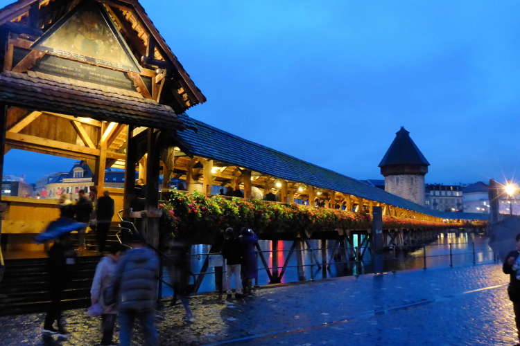 Am Hauptpostamt geht es, die Seebrücke rechts liegen lassend, geradeaus Richtung Altstadt. Die Kapellbrücke mit dem markanten achteckigen Wasserturm liegt jetzt direkt vor uns. Der Turm ist vom Grund ab 34,5 m hoch und diente lange Jahre als Gefängnis. Heute ist er sicher das am meisten fotografierte Gebäude der Stadt.