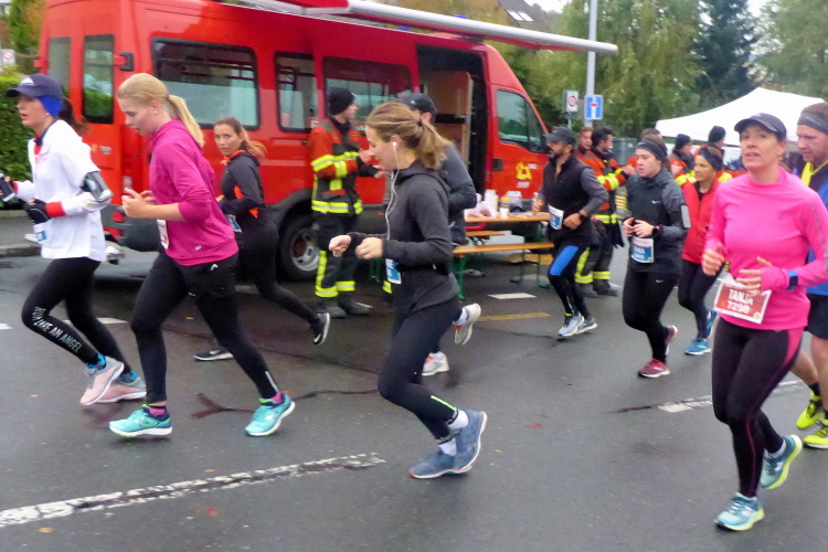 Hinter dem Eissportzentrum geht es ein Stück bergauf; hier falle ich kurz ins Gehen. Auf der anderen Seite führt die Straße erneut bergab. Von oben hat man eine tolle Aussicht über die imposanten Läufermassen vor uns. Im Stadtteil Wartegg / Schönbühl haben die Helfer an der VP alle Hände voll zu tun. Nach knapp 5 Kilometern sind die Getränke bereits heiß begehrt. Die Guggenmusik Rotseemöwen steht unterm Dach eines Einkaufszentrums und unterhält von dort mit flotten Rhythmen.