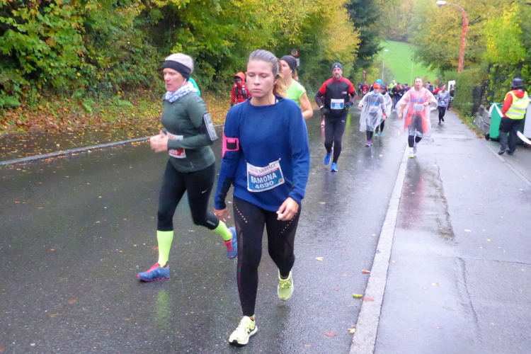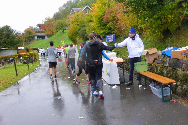 Es geht nun etwas länger hinauf und ungefähr auf halber Strecke bieten Privatpersonen Obst und viel Applaus. Bei schönem Wetter wird dieser Service sicher besser angenommen. Eben überholt mich der Pacer für Marathon 4h30 mit einer großen Gruppe. Trotzdem läuft es bei mir gut. Oben liegt die zweite VP. Wir haben mittlerweile bereits 8 sehr kurzweilige Kilometer hinter uns gebracht. Welch ein Zufall! Gerade will ich weiterlaufen, da erkenne ich bekannte Gesichter: Norbert und Klaus sind gemeinsam unterwegs.