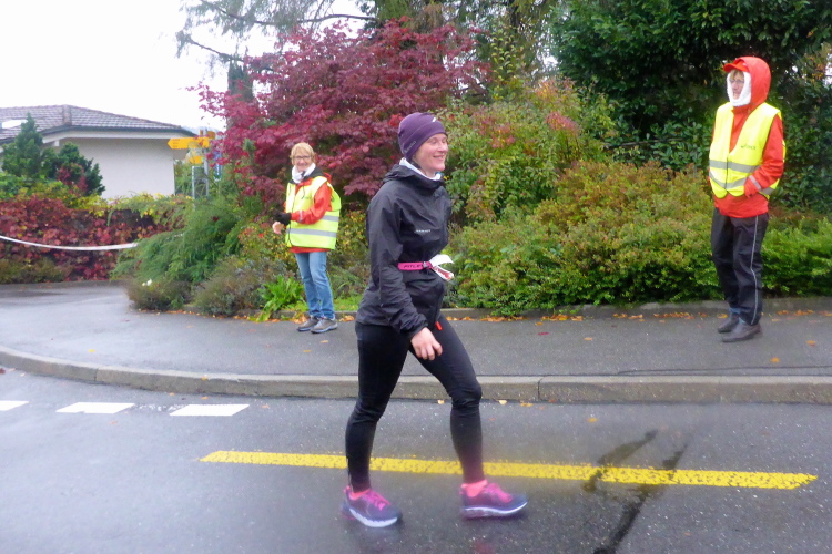 Auch die Musikkapellen spielen immer noch, was vor allem an den Steigungen sehr hilfreich ist. Schon die ganze Zeit freue ich mich auf das lange Gefälle nach Kastanienbaum hinunter. Gerade in diesem tollen Abschnitt schlägt gnadenlos ein Krampf in meinem linken Oberschenkel zu. Ich muss tatsächlich genau vor einer Streckenpostin stehen bleiben. Sie bietet Hilfe an, aber das muss ich selber regeln. Ein vorsichtiges Anlaufen zeigt, dass es langsam weiter gehen kann. Vermutlich habe ich doch zu wenig getrunken, das muss ich von nun an besser machen.
