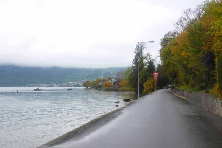 Wir sind nun oberhalb, ganz nah am See, leider verhindern ein Zaun und hohe Bäume den direkten Blick. Die Berge am gegenüberliegenden Seeufer sind jedoch zum Greifen nah. Unter den tiefhängenden Wolken kann man tatsächlich den ersten Schnee erkennen. Rechts direkt an der Strecke grasen Kühe auf abschüssiger Weide. Es geht wieder bergab, und ich lasse es laufen.
