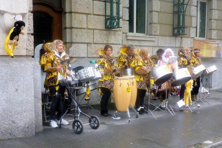 Schnell erreichen wir das langgezogene Casineum, einem bekannten Club mit Casino, während gegenüber die Fassade der Markuskirche einen attraktiven Kontrast bildet. Die Mädels von der Guggenmusik in ihren goldenen Kostümen geben einen beschwingten Laufrhythmus vor. Nahtlos übernimmt nach ein paar hundert Metern die nächste Band die musikalische Unterhaltung. Wir biegen auf den Schwanenplatz ein. Am Vortag herrschte hier noch Verkehrsgetümmel, nun steppt der Bär mit Musik und Jubel der Zuschauer. Rechts liegt das bereits erwähnte Hotel Schweizerhof.