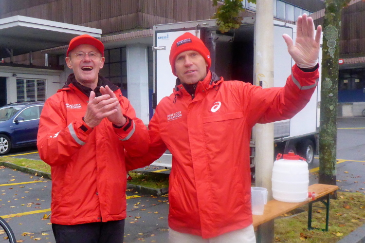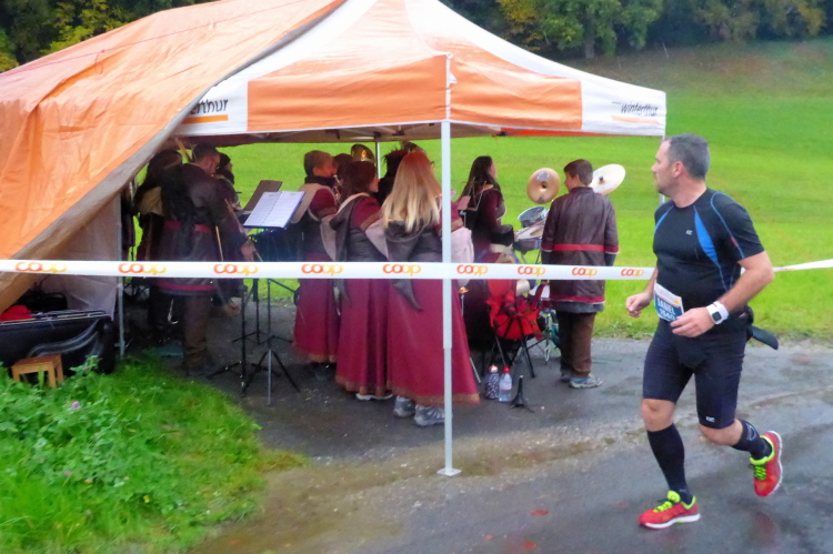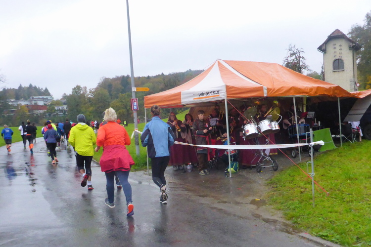 Diese Straße ist jetzt in der Mitte geteilt. Auf der anderen Spur kommen schon die schnelleren Läufer entgegen, die die Wende bei km 21 bereits hinter sich haben und sich nun auf der zweiten Runde befinden. Den Alphörnern läuft das Wasser in die Trichter, denn nur die Spieler stehen unter einem kleinen Dächlein. Das scheint den Instrumenten allerdings nichts auszumachen. Sie geben unentwegt ihre wunderbaren Töne von sich.