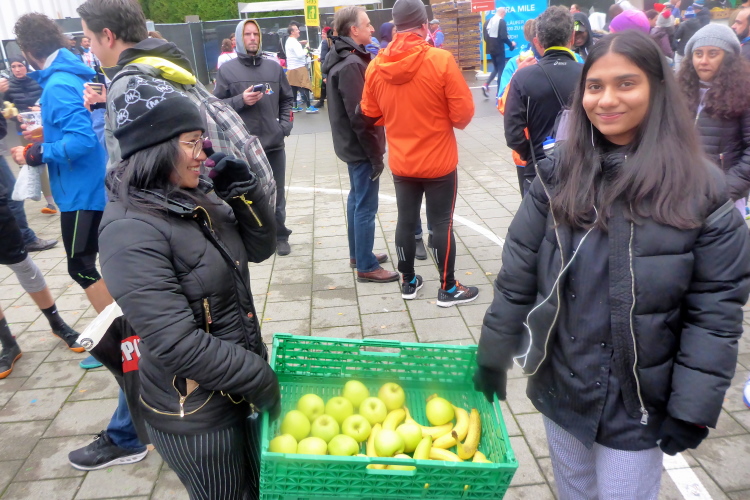 Im Ziel werden die Marathonläufer nach links geleitet. Hier gibt es zunächst Glückwünsche und die große schwere Medaille sowie ein Schlauchtuch. Am Ausgang erhalten alle eine gefüllte Flasche des Sponsors mit einem Sportgetränk. Sofort werden mir Bananen und Äpfel angeboten. Um die Ecke gibt es herrlich warme Bouillon.