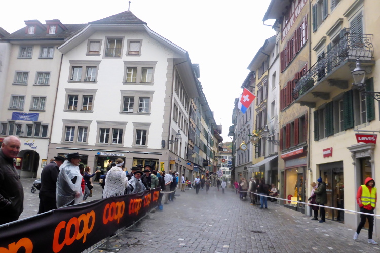 In der schmalen Gasse der Altstadt reihen sich die Schaufenster der Nobelmarken aneinander. Wir laufen nun zwischen den schönen alten Häusern parallel zur Reuss richtungsmäßig wieder zurück. Der Weinmarkt, das frühere Stadtzentrum, ist mit Blumen geschmückt. Für die Läufer wurde extra ein Weg abgesperrt.