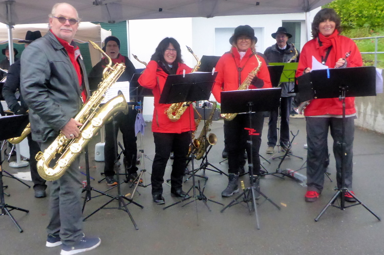 Die nächste Steigung ist bereits in Sicht. Hier steht die Guggenmusik „Nölli Grötze Lozärn“ kurz vor dem Gipfel und zieht die Läufer unwiderstehlich hinauf. Dahinter hat sich in Uniform eine Abordnung der Freiwilligen Feuerwehr von Horw postiert und klatscht was das Zeug hält. Oben zeigt eine hohe Fahne km 5.
