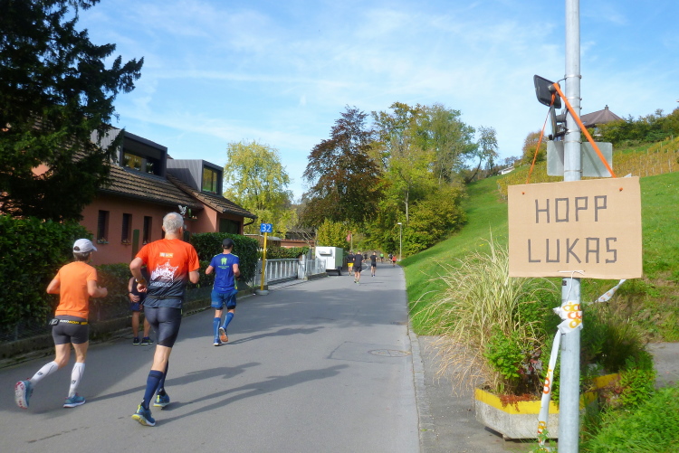 Wartegg, gleich haben wir Kilometer fünf geschafft. Ich kann auf Walter auflaufen, der sich in einem fast schon antiquierten Deutschen Fußballnationaltrikot als Böörti Fogts ausgibt und oft angesprochen wird. Alle Musikbands aufzählen kann ich nicht, da hätte ich viel zu tun. Die Guggenmusig (ja, richtig geschrieben!) Löchlitramper Littau hat gerade Pause. Dafür brauchen sich die Helfer an der folgenden Trinkstelle nicht wegen der fehlenden Arbeit zu beklagen. Es wird eifrig zugegriffen. Genug trinken, wir wurden noch am Start darauf hingewiesen, denn die Temperaturen steigen jetzt merklich. Wasser, Iso, Bananen, Riegel stehen im Angebot und später wird auch Cola gereicht.