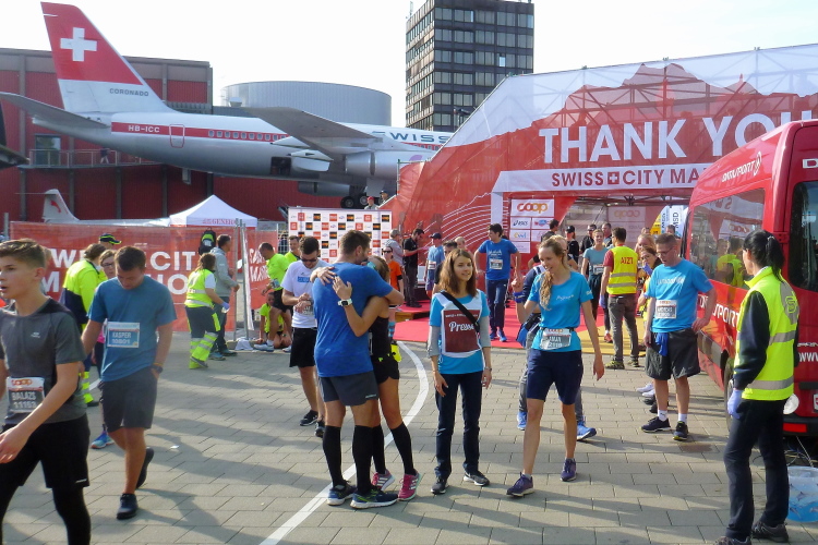 Daniel hat schon Recht, es ist einer der schönsten Stadtläufe in der Schweiz. Am Ausgang erhalten wir die Medaillen, die mit goldenen Band ist für die Marathonis, die mit rotem Band für die Halben. Ein paar Meter weiter gibt es die süße Gabe eines Zuckerbäckers und gleich danach werden uns Früchte auf glänzendem Tablett angeboten und manchmal sogar nachgetragen. Im Zielbereich hole ich mir als erstes ein Bier (Gutschein an der Startnummer) und danach gleich das Finishergeschenk, ein blaues Funktionsshirt.