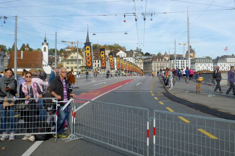 Gleich beim Casino geht es volkstümlich weiter, die ersten Alphornbläser halten ihre Instrumente „unter Dampf“. Schnell erreichen wir nach knapp zehn Minuten den Schweizerhof, wo untertags der Verkehr fließt. Jetzt ist alles zu Fuß unterwegs, die einen auf Zeit, die anderen, um auf einen interessanten Beobachterplatz zu kommen. In einem Halbbogen nach links laufen wir auf die Seebrücke zu. Im Hintergrund erheben sich die Ausläufer der Alpen über die städtische Silhouette. Schönes Bild an diesem sonnigen Herbsttag mit blauem Himmel und lauffreundlichen Temperaturen von jetzt etwa zehn Grad.