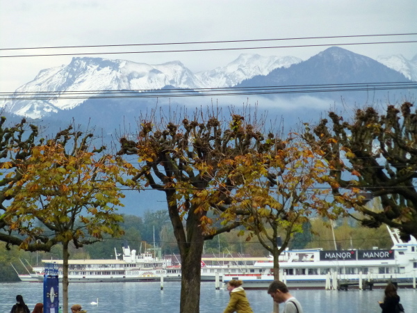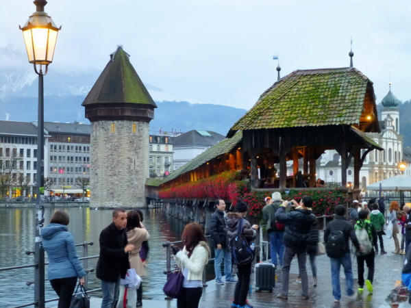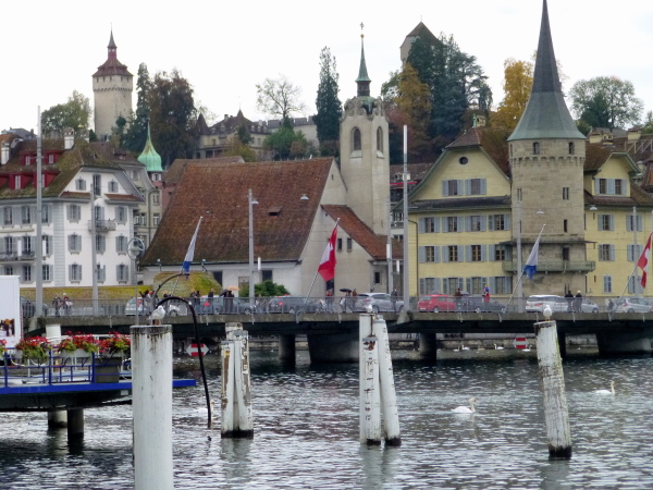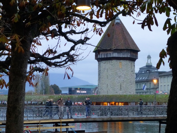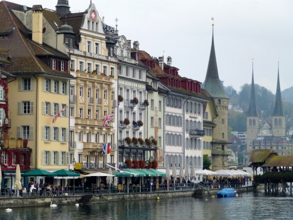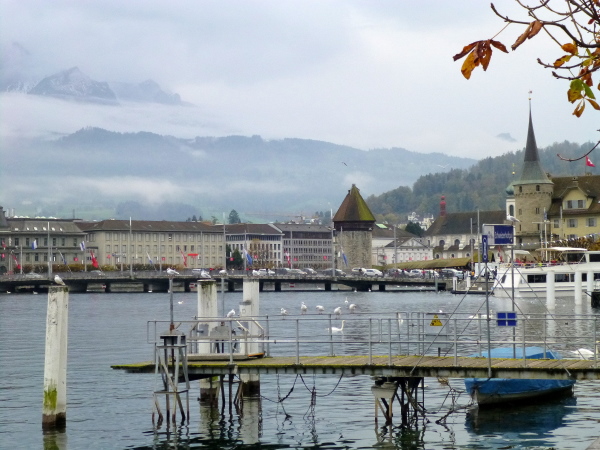 Mit dem von prächtigen Fassaden gerahmten Schwanenplatz erreichen wir das Tor zur mittelalterlichen Altstadt. In das Netz der alten Gassen tauchen wir jedoch nicht ein – noch nicht. Vielmehr geht es sogleich weiter auf die Seebrücke, wo sich uns das fast schon allgegenwärtige, weil jedes Luzern-Werbeplakat schmückende Panorama mit der Kapellbrücke und der sich entlang der Reuss bis zum Horizont hinziehenden Altstadt und den dahinter aufsteigenden Bergen bietet. Nun ja, die Berge müssen wir uns heute leider denken. Den Hochnebel haben die Wetterfrösche bei Ihrer Sonnenprognose wohl irgendwie übersehen.