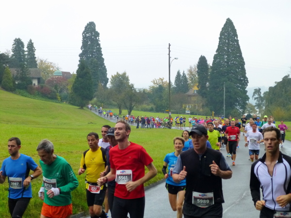 Der Laufkurs Luzerns ist insgesamt recht flach und ohne scharfe Kurven, damit also für schnelle Zeiten durchaus prädestiniert. Aber wie heißt es so schön? Keine Regel ohne Ausnahme. Und so erwartet uns etwa bei km 5 eine kleine konditionelle Herausforderung. Zwanzig Höhenmeter gilt es bei relativ moderater Steigung zu bewältigen und zwei Kilometer weiter sind es noch einmal dreißig. Noch unverbraucht und frisch aufgewärmt nimmt der weiterhin dichte Läuferstrom diese Hürden jedoch noch locker und gibt auf den jeweils folgenden Gefällepassagen richtig Gas.