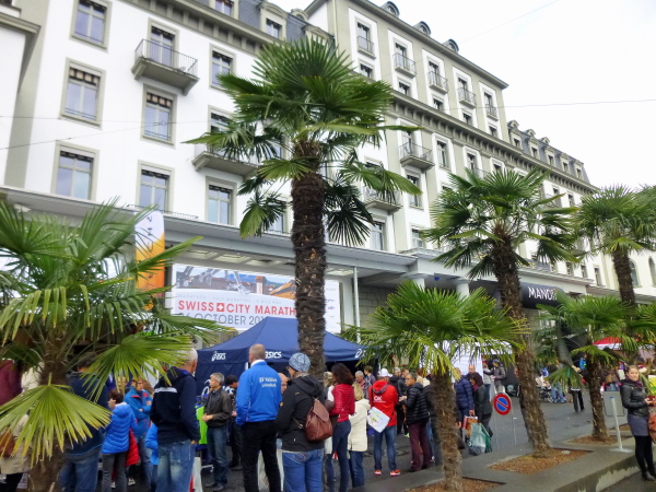 Bewahrt hat sich Luzern über die Jahre die wohl feudalste Location für das Vorstart-Prozedere. Auch heute noch schlägt das Herz der Veranstaltung vor dem großen Lauf in der noblen Fünf-Stern-Herberge "Schweizerhof" direkt in der Altstadt und an den Gestaden des Vierwaldstätter Sees. Seit 1845 verwöhnt dieser traditionsreiche Hotelpalast Gäste aus aller Welt. Die im Startgeld inbegriffene Pasta und Rösti als vormarathonischen Appetizer darf man daher in überaus stilvollem Ambiente in einem der prunkvollen Säle des Grand Hotels oder auch auf der Sonnenterrasse mit Seeblick genießen. Fast schon erstaunlich ist, dass trotz vieler tausend Starter nicht das totale Chaos ausbricht. Im Bringolfsaal bekomme ich ohne viel Warten meine Startnummer. Vergleichsweise überschaubar ist die Laufmesse. Macht nichts. Umso schneller kann man frisch gestärkt zum Bummel in die Altstadtgassen gleich hinter dem Hotel eintauchen.