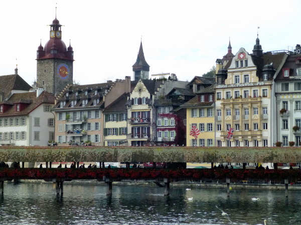Volle Sicht haben wir aber auf die berühmte Kapellbrücke. Auf etwa 200 Metern Länge verbindet die bereits aus dem Jahr 1332 datierende überdachte Holzbrücke mit dem markant-trutzigen achteckigen Wasserturm mittendrin die Ufer der Reuss, allerdings nicht etwa auf dem direkten Weg, sondern in einer Art Schleife. Ein Großfeuer hatte die Kapellbrücke zwar 1993 in großen Teilen zerstört, doch wurde sie originalgetreu rekonstruiert, sodass sie heute wieder in voller Pracht ihren Job als „Wahrzeichen“ Luzerns erfüllen kann.
