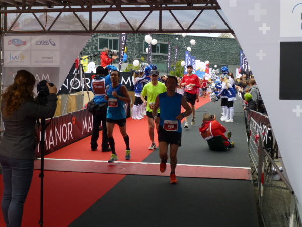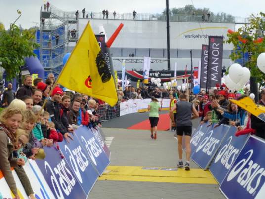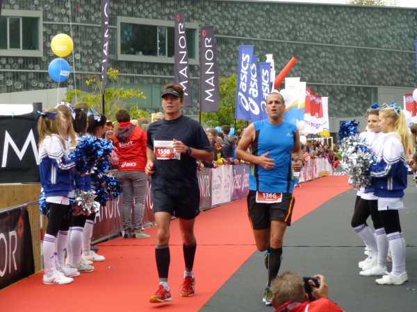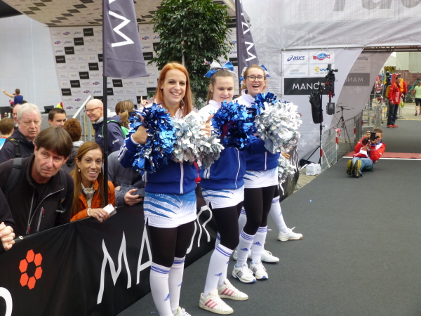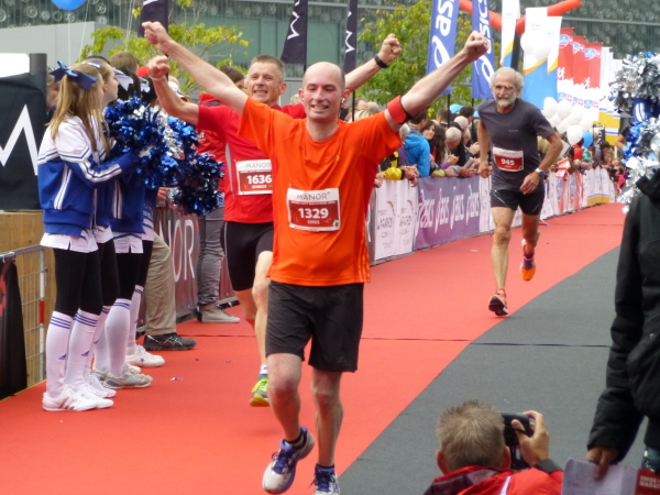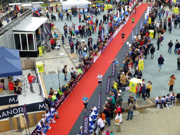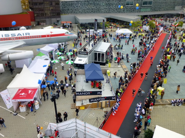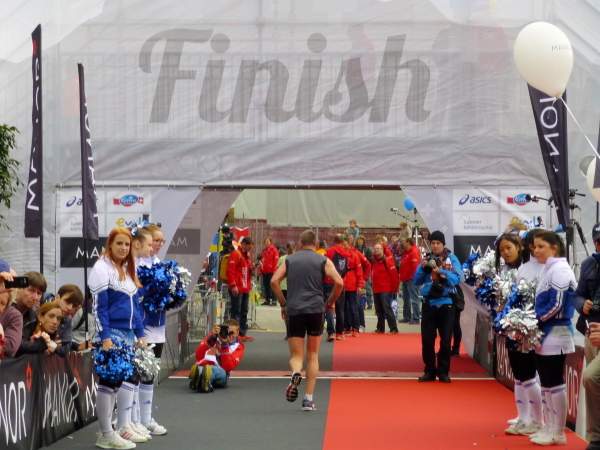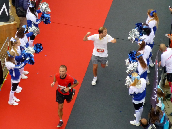 Das nahende Ziel ist zunächst noch nicht zu sehen, aber durchaus zu hören. Ein beträchtlicher Teil der Zuschauer ist anscheinend aus dem Zentrum gen Ziel gezogen und bereit, den müden Helden der klassischen Distanz einen rauschenden Empfang zu bereiten. „Welcome“ prangt in großen Lettern über dem Tor zum weitläufigen Innenhof des Museumsgeländes. Und dann geht die Post so richtig ab. Die letzten hundert Meter sind einfach unglaublich. Ein Menschenmeer wogt beiderseits der Strecke und feuert uns, dicht an dicht über die Banden gebeugt, zum Endspurt an. Über den roten Teppich, vorbei an wehenden Fahnen und den Cheerleader-Girls, persönlich über Lautsprecher vom Zielspeaker begrüßt – so fliegen wir durch den Zielbogen. Was für ein Finale!